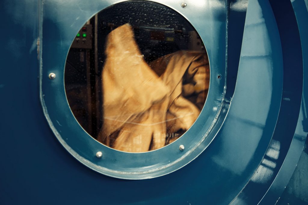 洗濯機のような巨大な機械の中では、洋服が何度も回転しながら洗われ、染められていく。