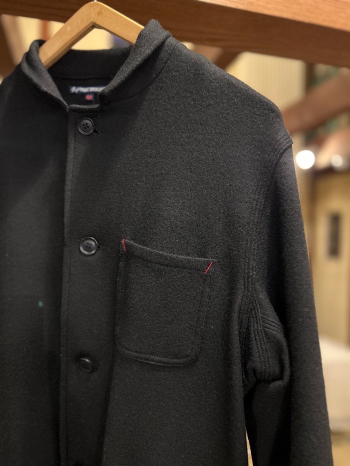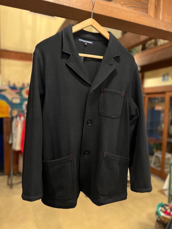 軽くて暖かいブラックのテーラード。ニット素材ですのでウール100%でありながら、伸縮性にも長けています。きれいめラインに寄り過ぎず、あえての三本針で仕上げる密かな遊び心。アームもややゆったりに仕上げてますので、シャツだけでなくスウェットなどとラフに合わせてもらえたらなと思います。