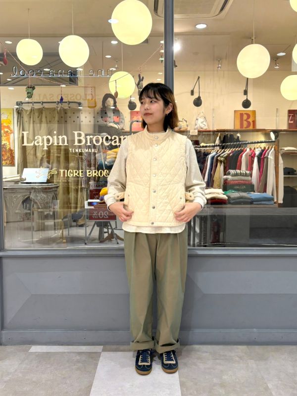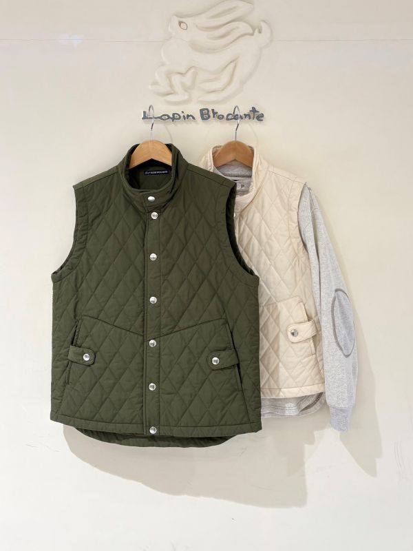 シンプルなオープンポケットベスト、そこまで肉厚ではないのでアウターの下に重ねて楽しめます。