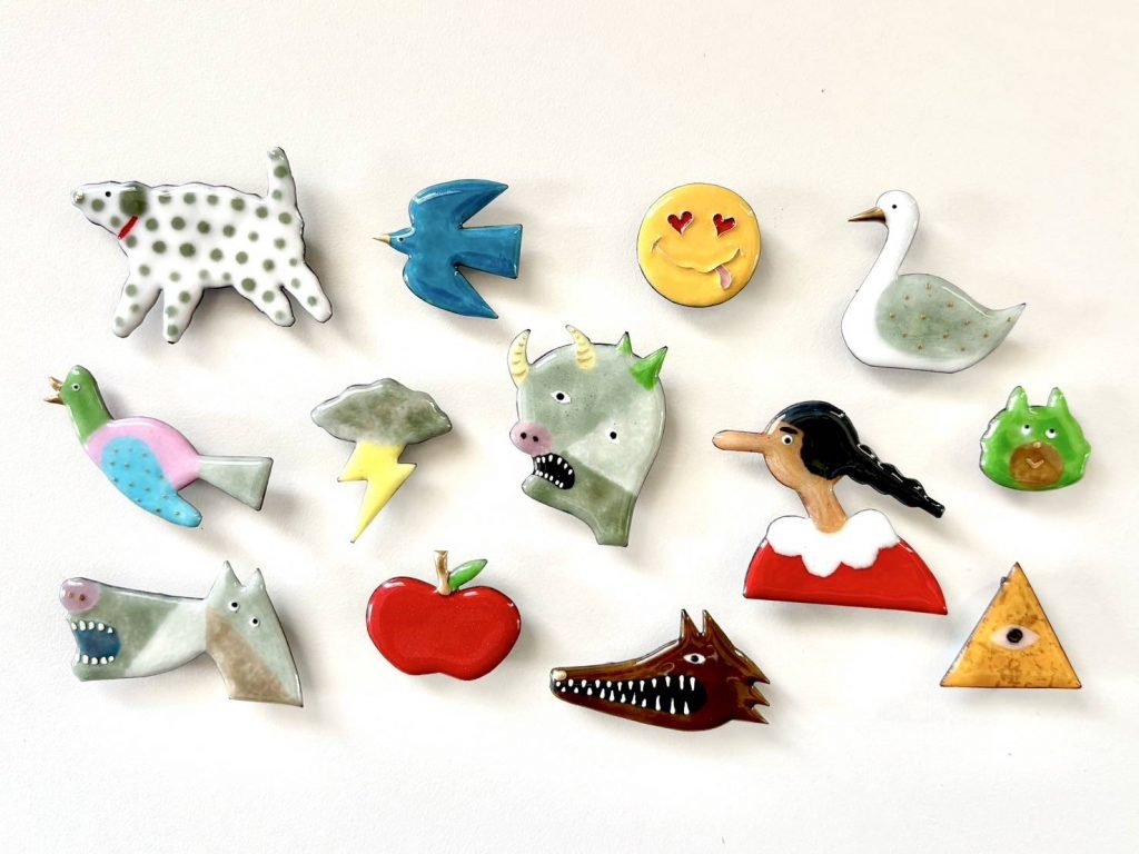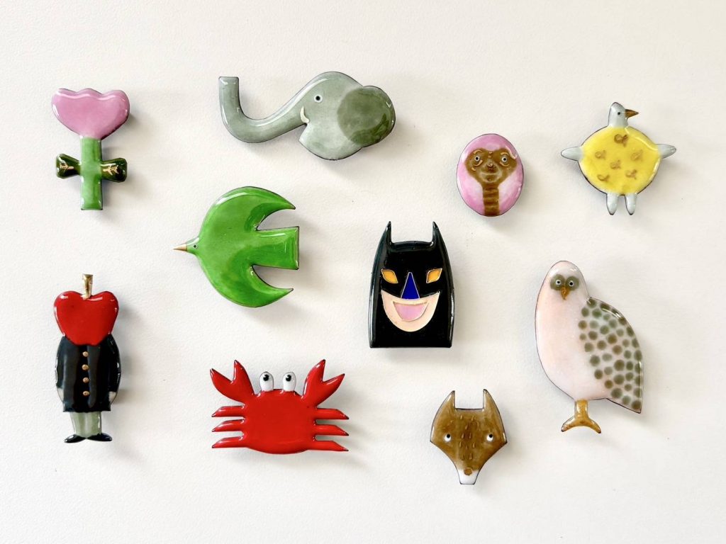 七宝焼きは金属板の上にガラス質の釉薬を乗せて高温で焼き付けて作る工芸手法。カットした銅板を木槌で手打ちし、裏地を焼き、下地を焼き、彩色して焼成、仕上げに独自の工程として金継ぎの要領でディティールを描き込む。見た目のユニークな可愛さは勿論ですが、実物を見たときに感じる手仕事の重なりや繊細さも魅力のひとつ。