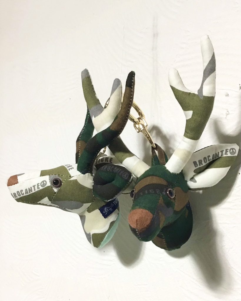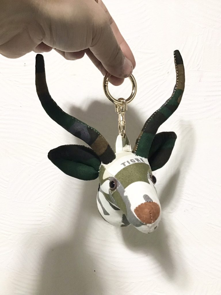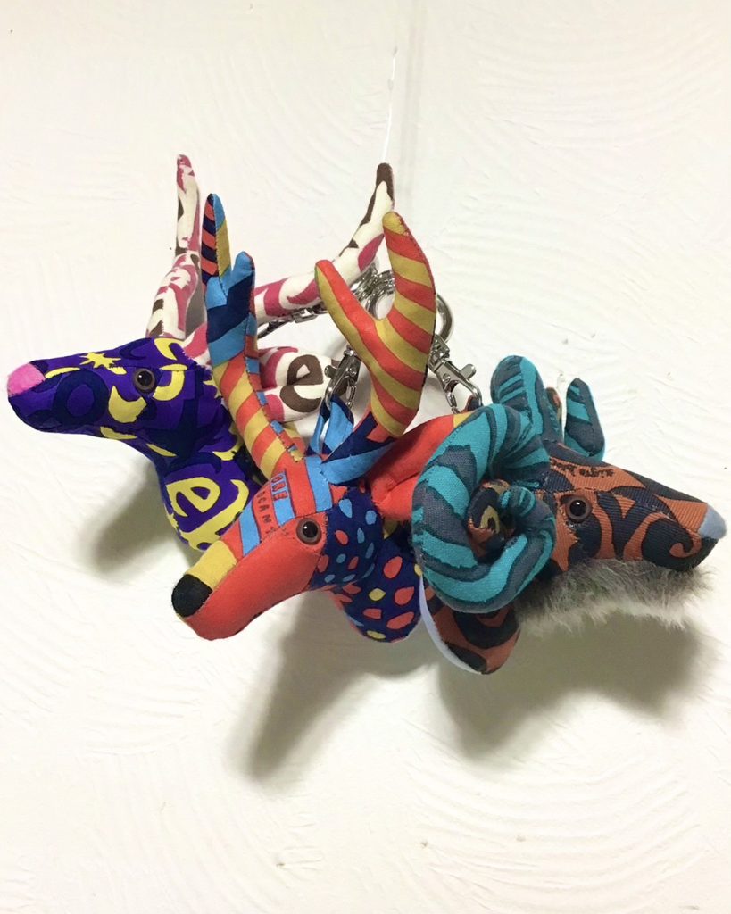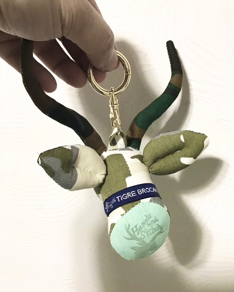 また、今回はオリジナル生地でキーホルダーサイズも作って頂きました。カモ柄や石北有美さん @yumi_ishikita とのコラボ柄テキスタイル、それぞれの柄を活かしてその動物の元の柄であるかのように仕立てられています。この小ささで角の先までしっかりとしたぬいぐるみの作りに職人の仕事を感じます。*price...各15,400yen