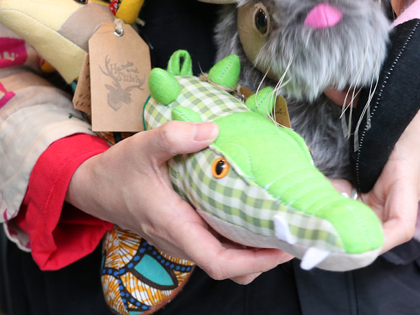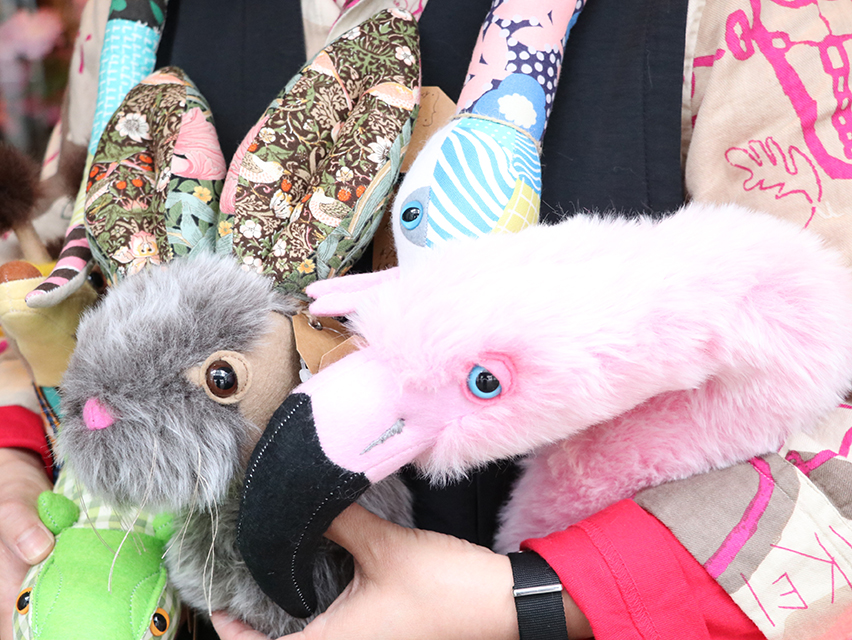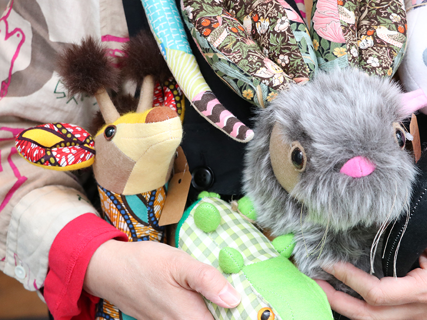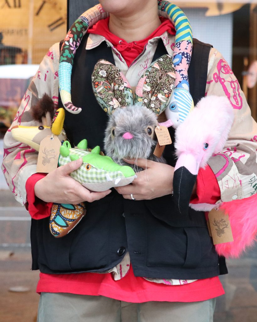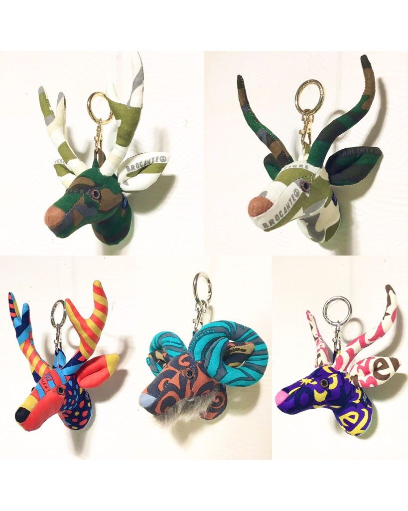 また、今回はオリジナル生地でキーホルダーサイズも作って頂きました。カモ柄や石北有美さん @yumi_ishikita とのコラボ柄テキスタイル、それぞれの柄を活かしてその動物の元の柄であるかのように仕立てられています。この小ささで角の先までしっかりとしたぬいぐるみの作りに職人の仕事を感じます。*price...各15,400yen