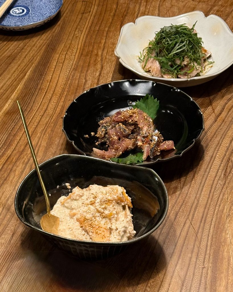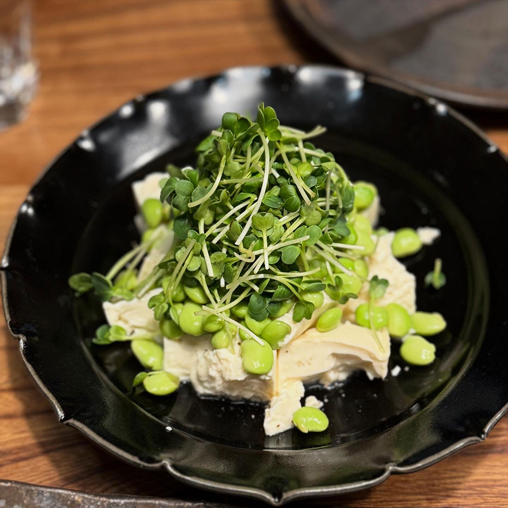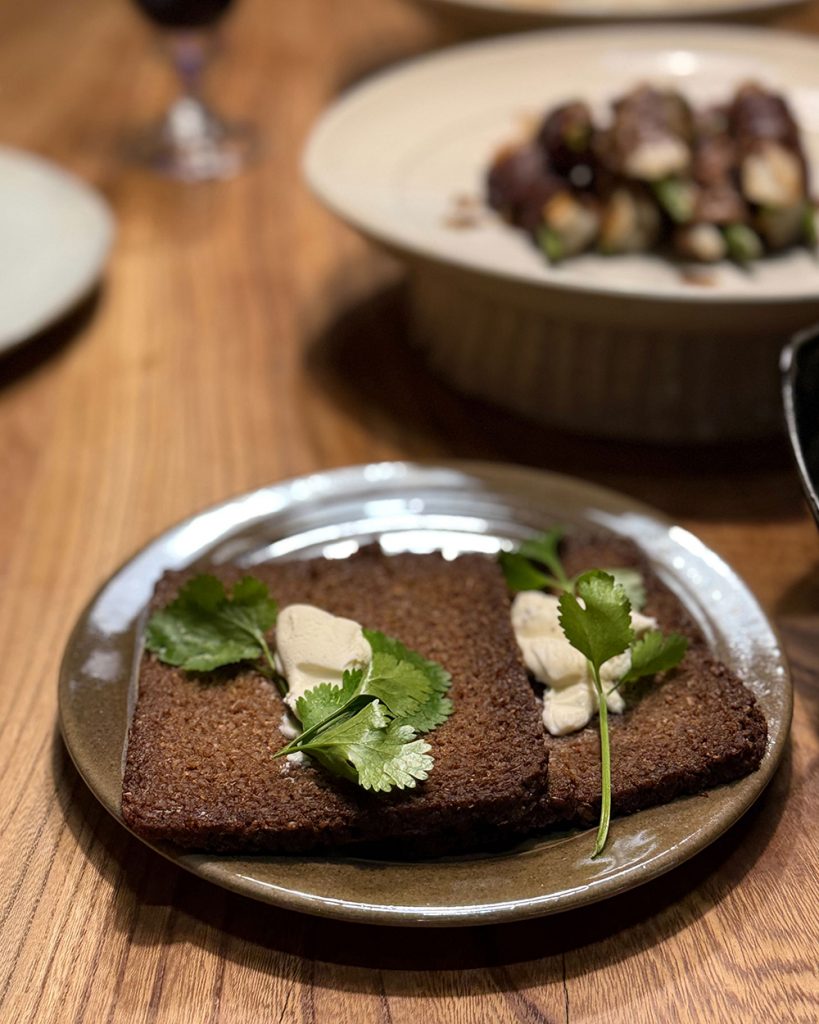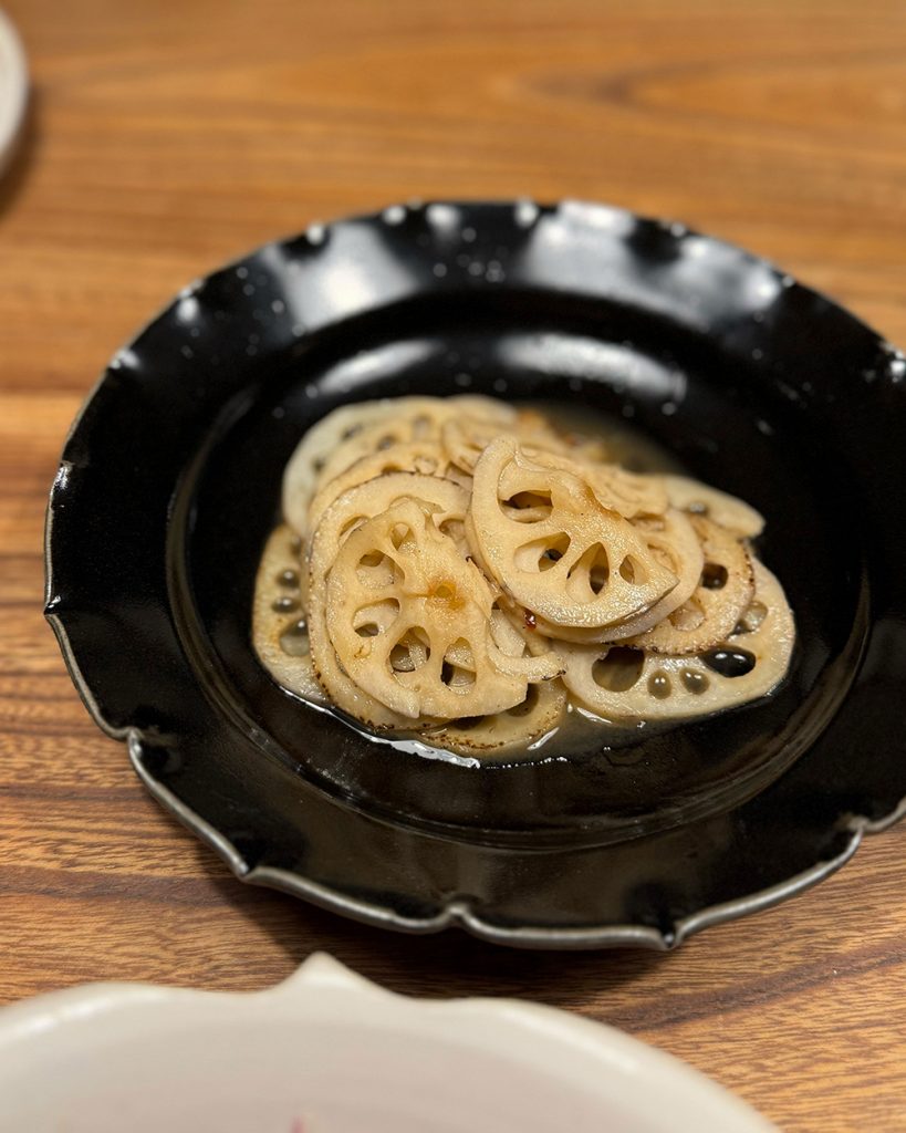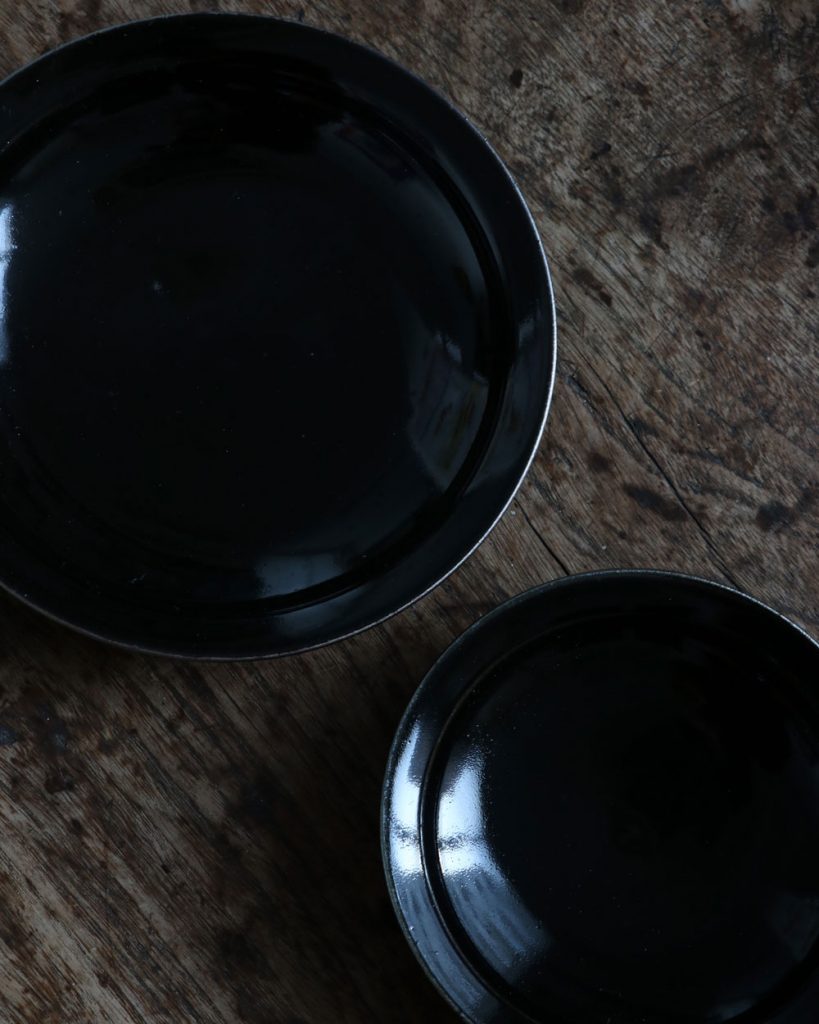 こちらは鉄分の多い黒釉のうつわ。先ほどの青磁釉と同じ形ですが、黒の深さに食材の色を映すつややかさ、まったく異なる趣です。ぐっと食材や料理を縁取って強調するかのような1枚です。