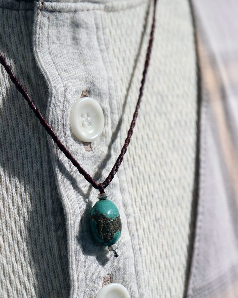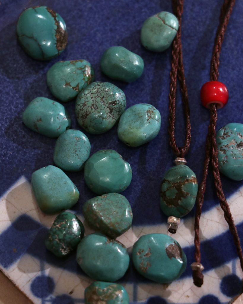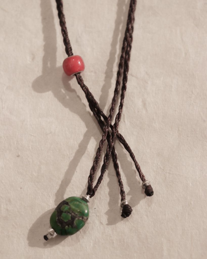 希少なチベットターコイズ。緑味深く、法具として人の手と歴史を渡り歩いてきた天然石。出会いにピンときた1点を写真の編み紐タイプ、もしくはトレードビーズと同じくシルバータイプでお仕立ていたします。