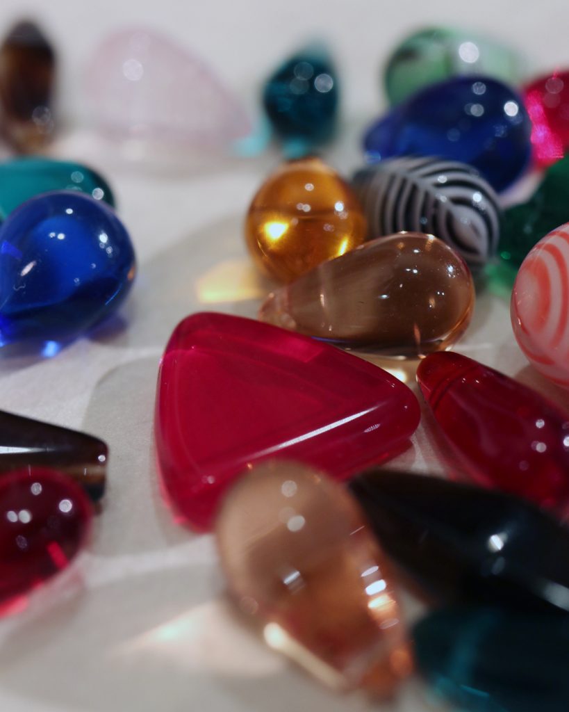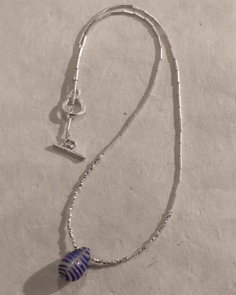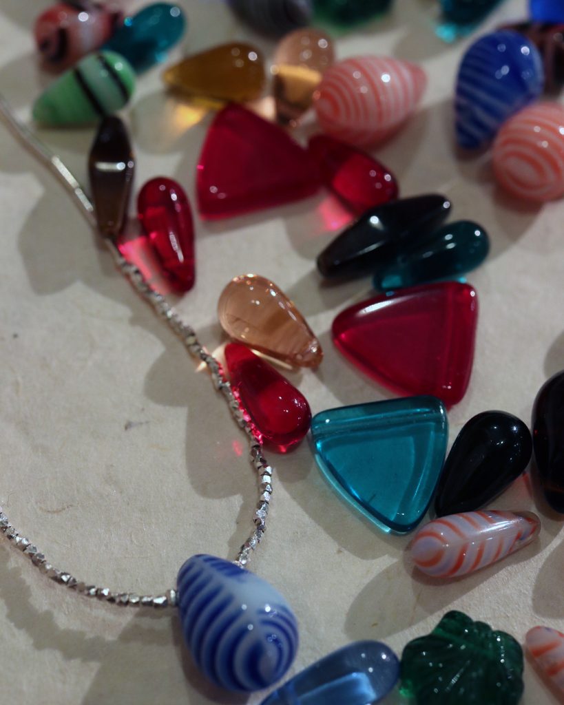 1930~1960年代のオールドグラスボヘミアントレードビーズ。色や形も様々に、文化や歴史を渡り歩いたビーズ、細やかにきらめくシルバーのビーズと合わせてシンプルなネックレスに。