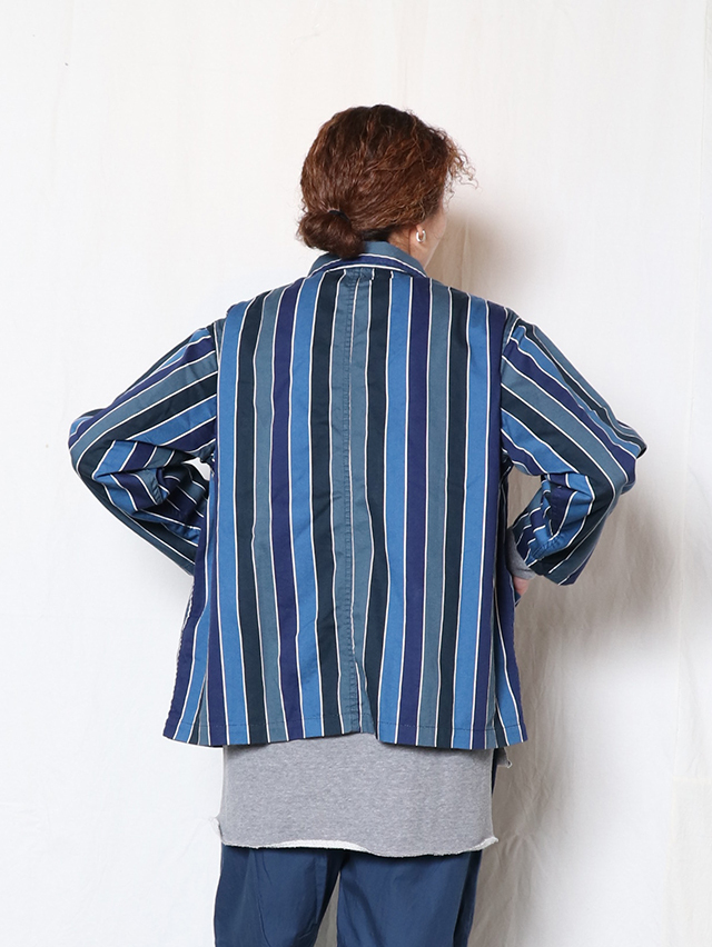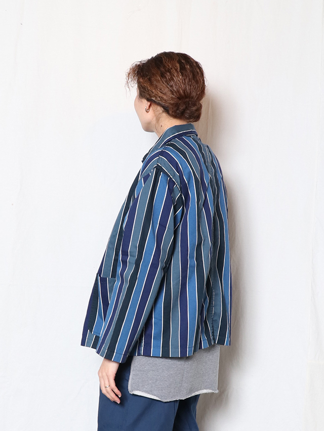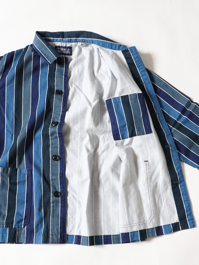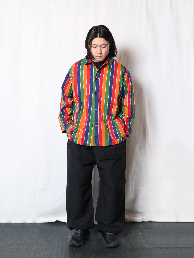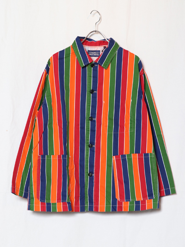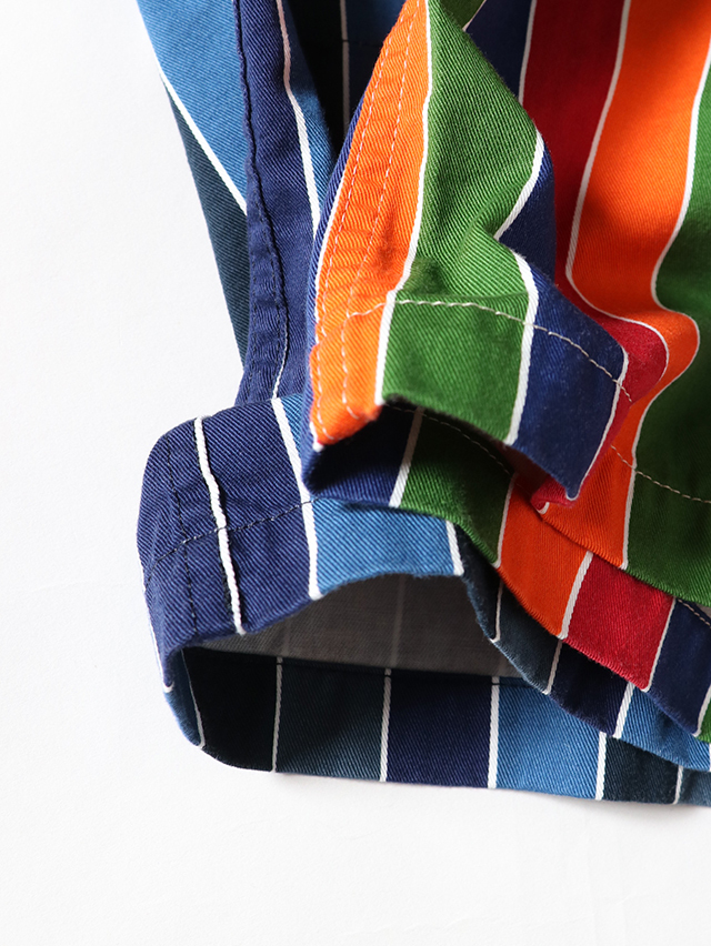70年代のショートパンツの古着からインスピレーションを受けた陽気なレインボーストライプデザイン。継ぎ目の出ないロータリースクリーンプリントで表現しています。形はレギュラーカバーオール。軽いジャケットで、さっと羽織れる一着。鮮やかな色合いが目を惹くアイテムです。
