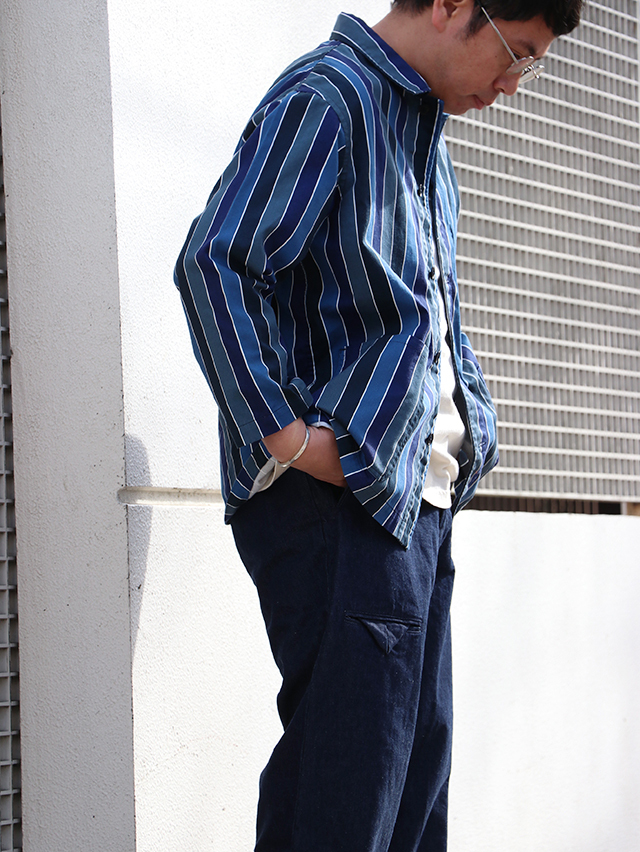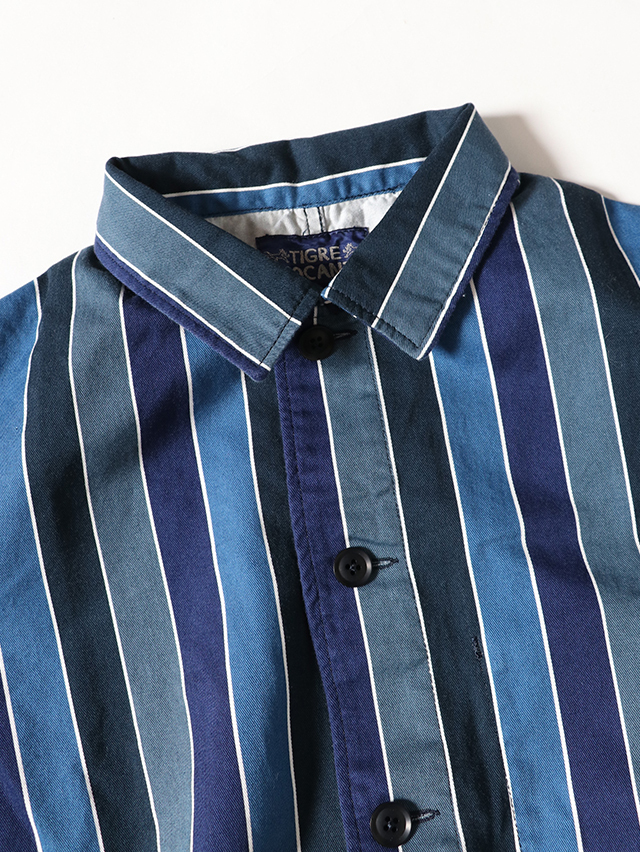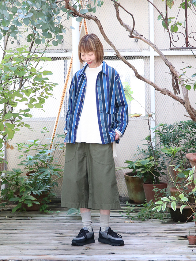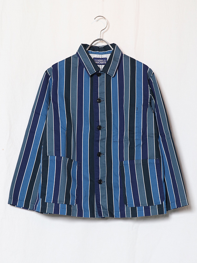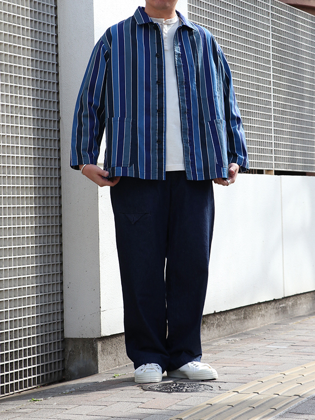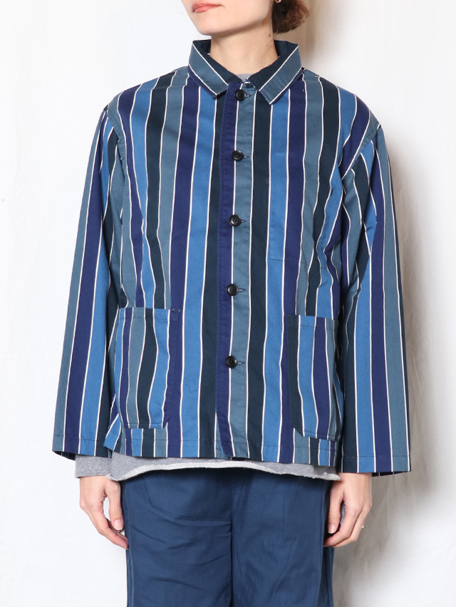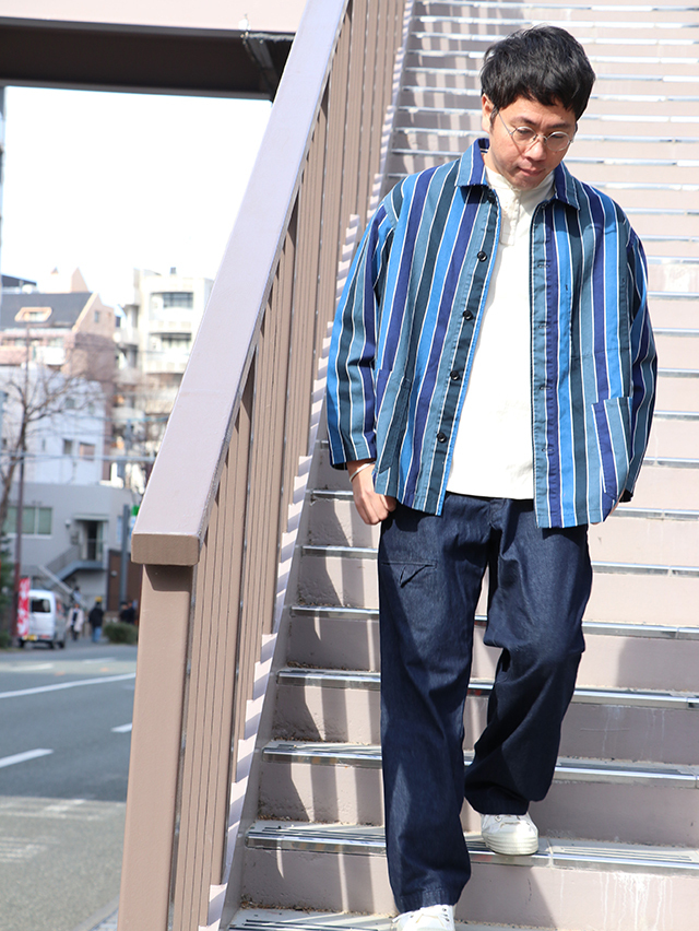 70年代のショートパンツの古着からインスピレーションを受けた陽気なレインボーストライプデザイン。継ぎ目の出ないロータリースクリーンプリントで表現しています。形はレギュラーカバーオール。軽いジャケットで、さっと羽織れる一着。鮮やかな色合いが目を惹くアイテムです。