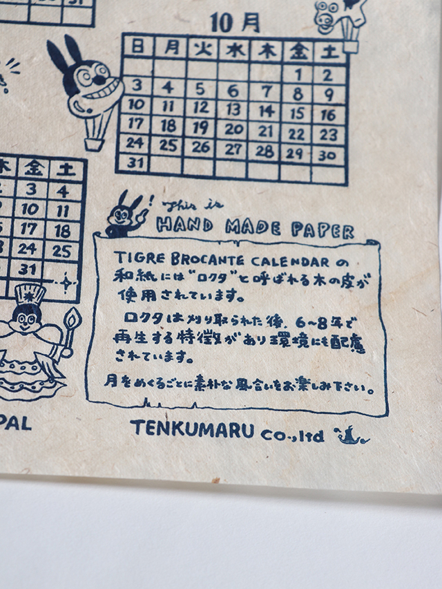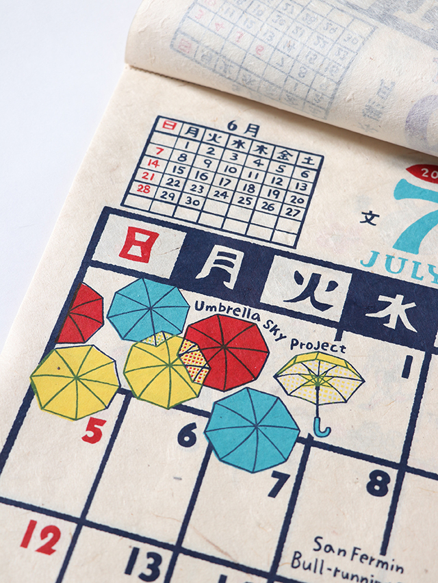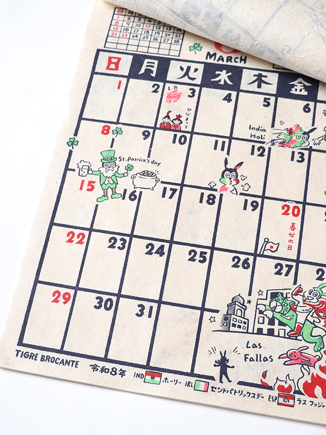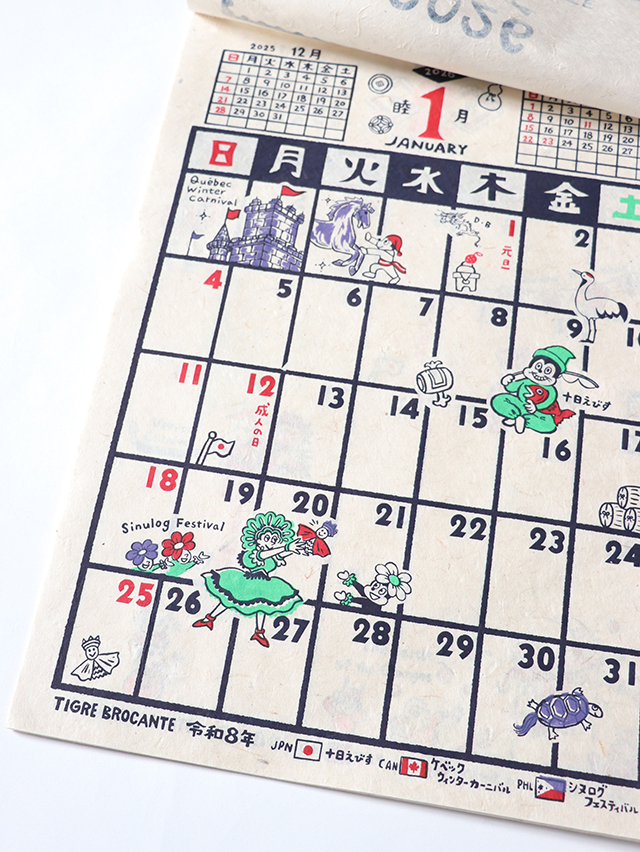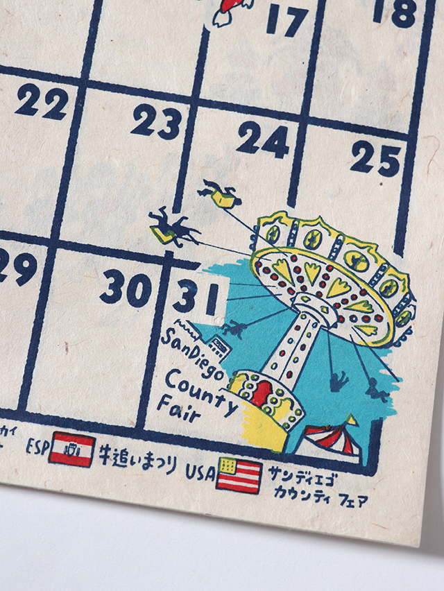 毎年人気のオリジナルカレンダー。ネパールで作られる手すきの紙にハンドプリントで刷った素朴なカレンダーです。今年のテーマは"お祭り"、世界各国のお祭りとナッティーが散りばめられたデザインです。