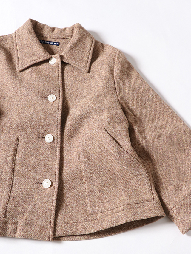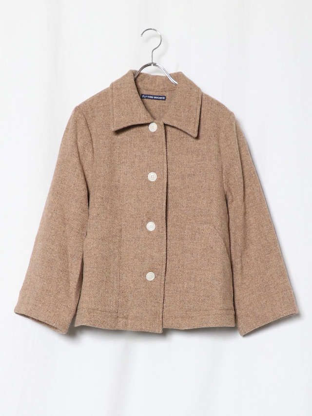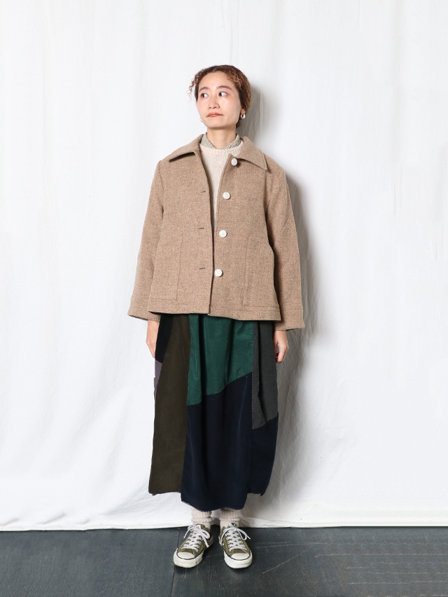 新作のレディースジャケット。襟が少し大きめでAラインシルエットの一枚、後身頃にはプリーツが入っており、ゆったりとした身幅です。素材は英国羊毛ツイード、英国産の羊毛を使用した、厚手で丈夫、非常に保温性が高い伝統的な毛織物です。裏地には滑らかな肌触りのリヨセルで袖の通しも良く、着て頂けるアイテムです。