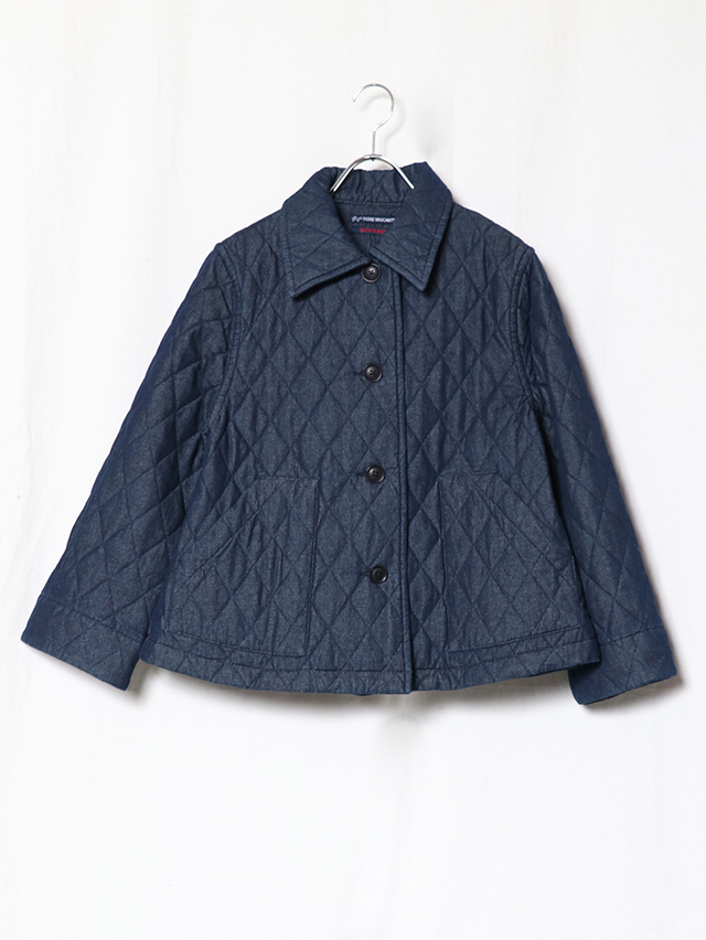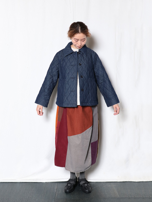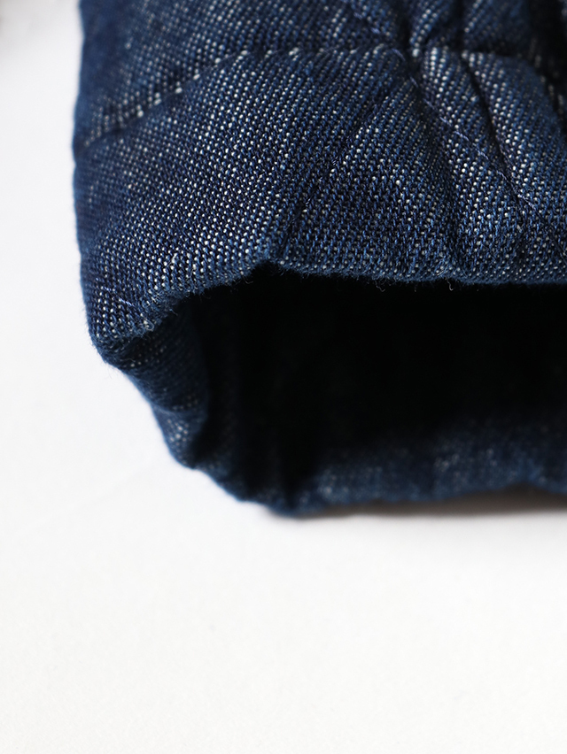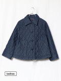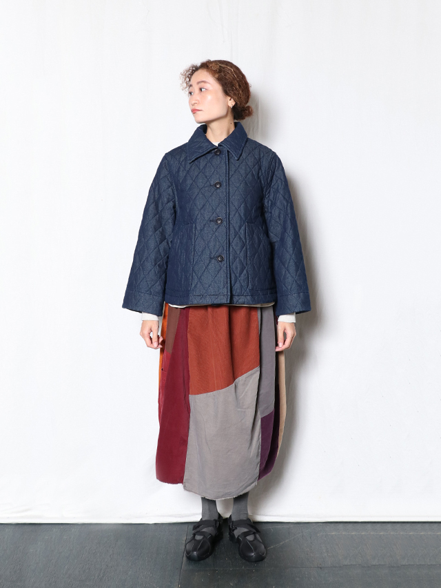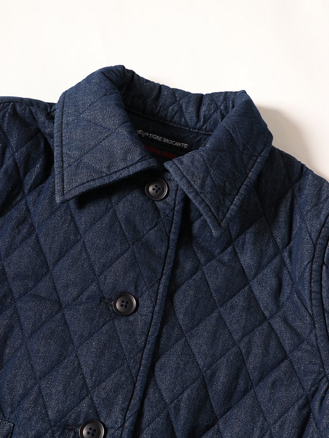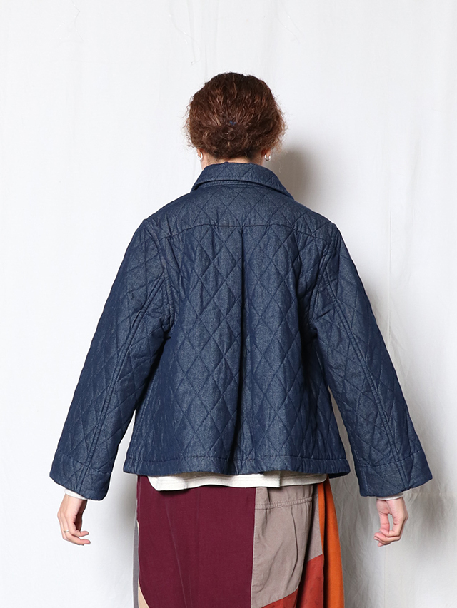 新作のレディースジャケット。襟が少し大きめでAラインシルエットの一枚、後身頃にはプリーツが入っており、ゆったりとした身幅です。素材は程良い厚さ7オンスのデニムのキルトを使用しています。着膨れないすっきりとしたテクスチャの生地です。すっきりと軽やかな着心地です。