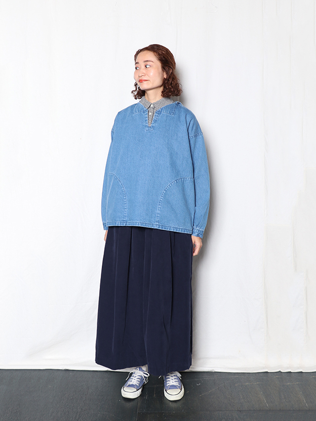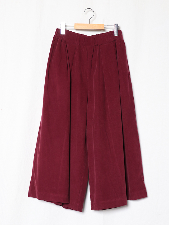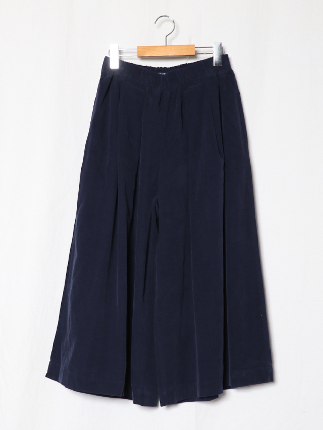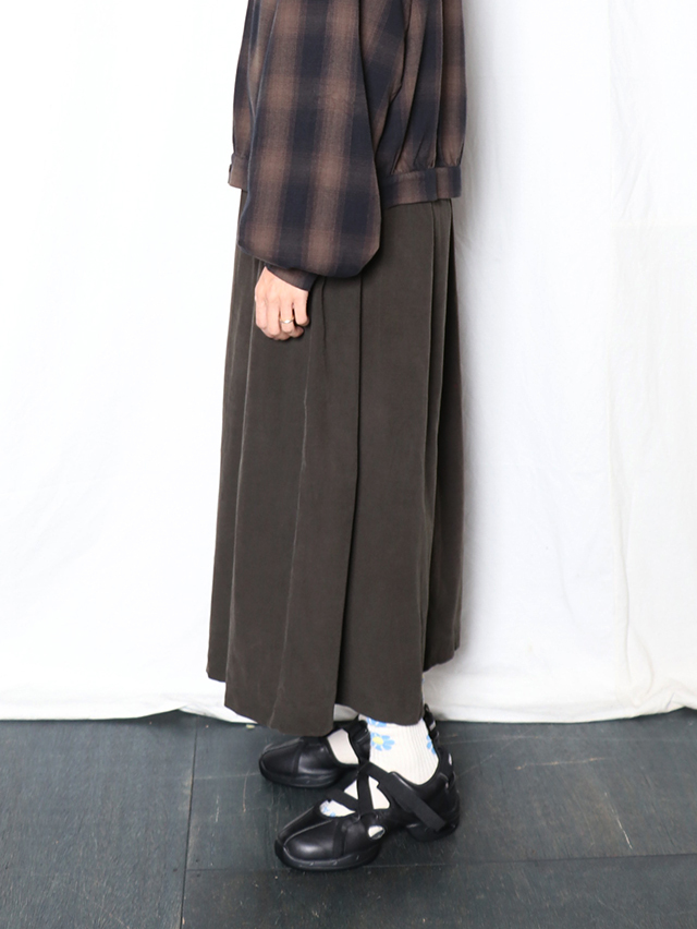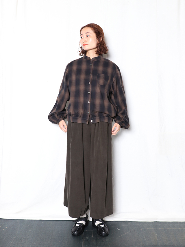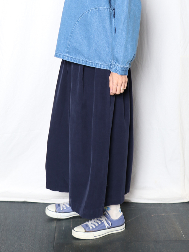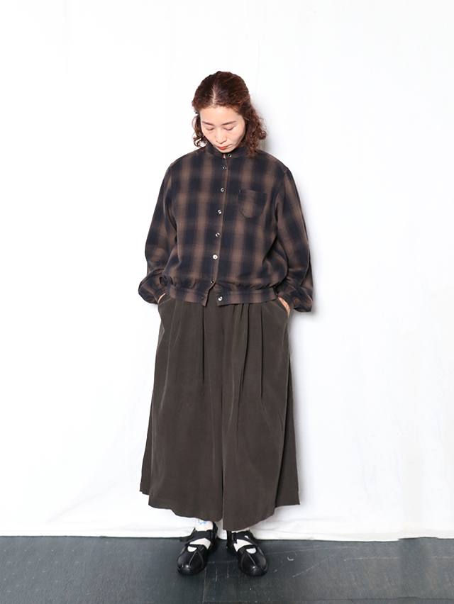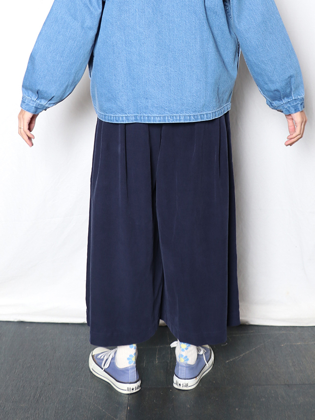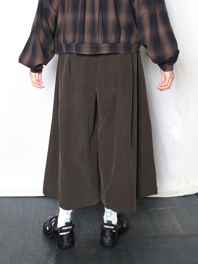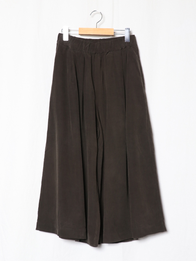 江戸時代から伝わる染色技法である東炊きによって染められたシャツコール素材。味わい深い色合いです。形はワイドシルエットのキュロット。ロング丈で出来上がりました。軽く穿けて季節を感じられる一本です。