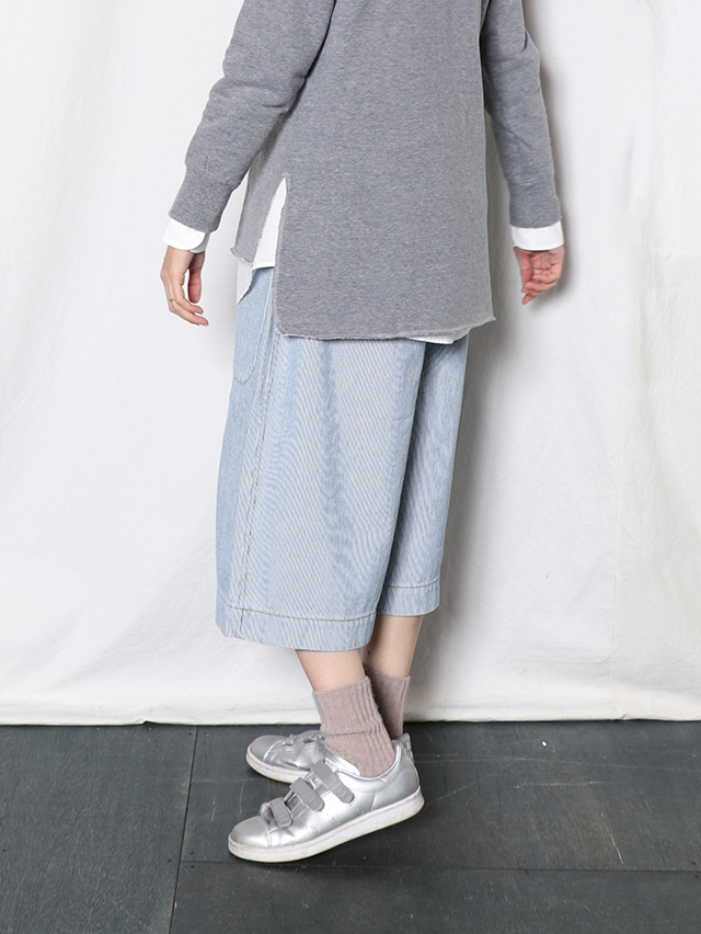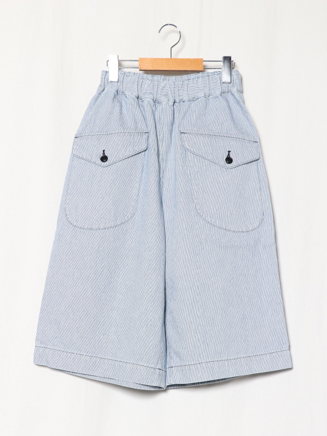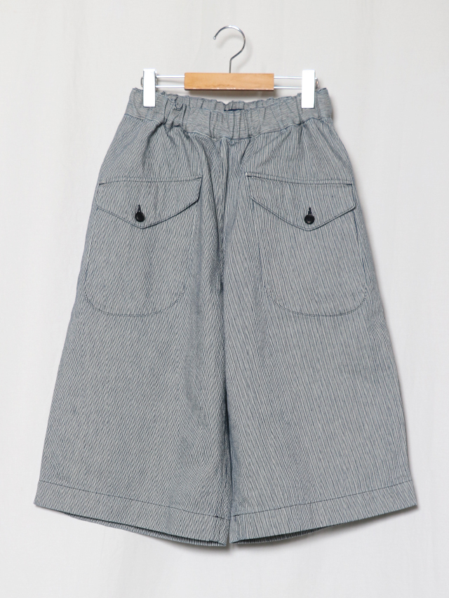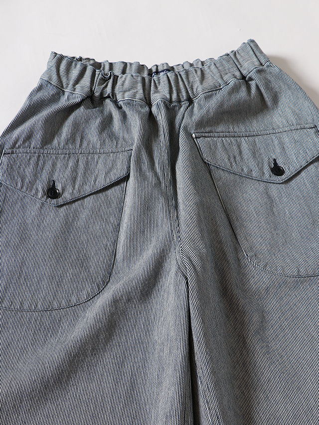 インディゴ染めされた糸を使用したヒッコリー生地から作る、新作のレディースパンツ。形は太めのカーゴキュロットパンツ。前身頃に丸いポケットが付いたデザインです。ウエストはゴム仕様で着脱も楽な一本。季節問わず、楽しめるアイテムです。カラーは濃いストライプがインディゴ、薄いストライプが加工を施したフェードとなります。