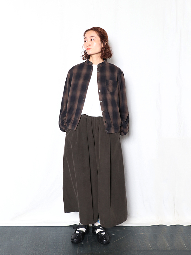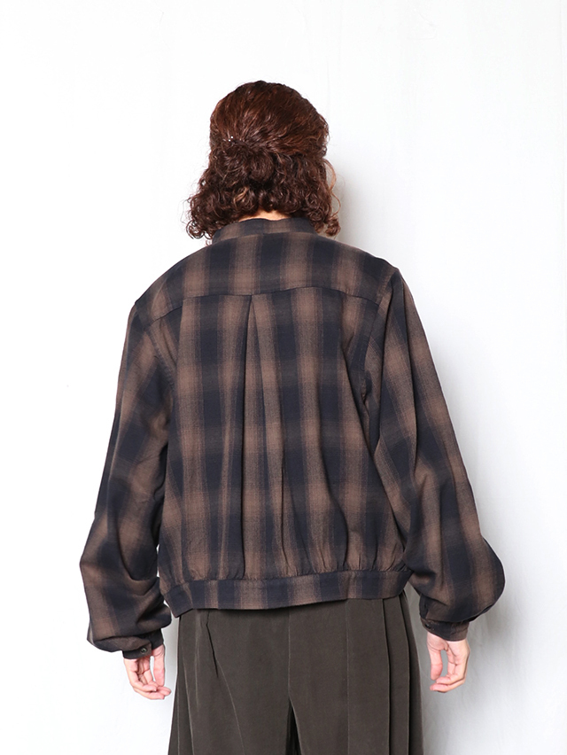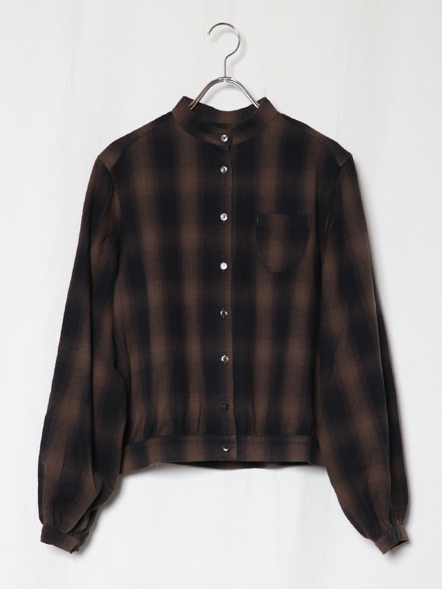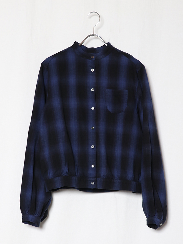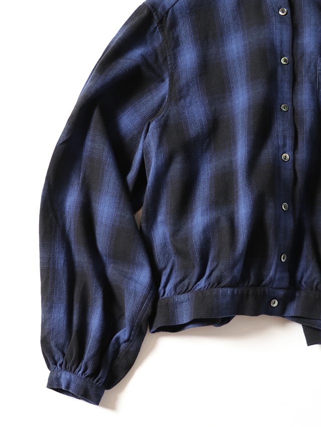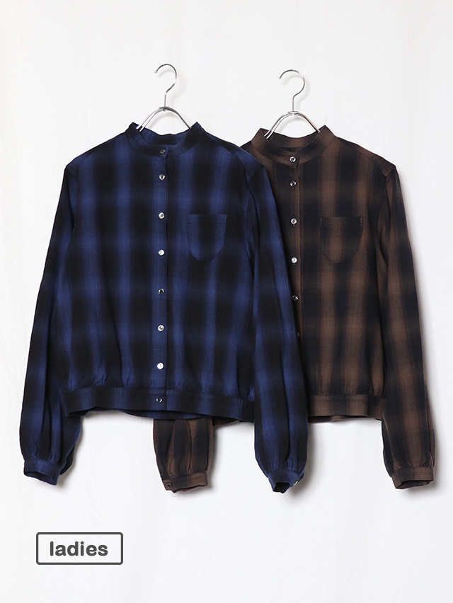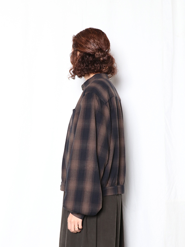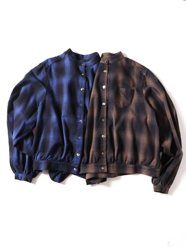 ふっくらとした柔らかな肌触りのシャギーオンブレ生地から作る新作のブラウス。色の濃淡が徐々に変化するグラデーション染めを施したチェック柄で、シャギーの毛羽立ちと組み合わさることで、チェックの境界線がぼやけ、より複雑な表情を見せます。形はすっきりとしたスタンドカラータイプ。ふんわりとしたシルエットで袖に少しボリュームのあるデザインになています。シャツジャケットのようにも使える一枚です。秋冬のコーディネートのぜひ。