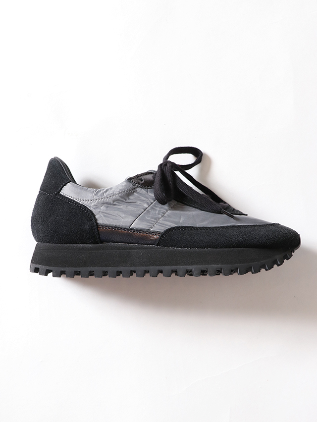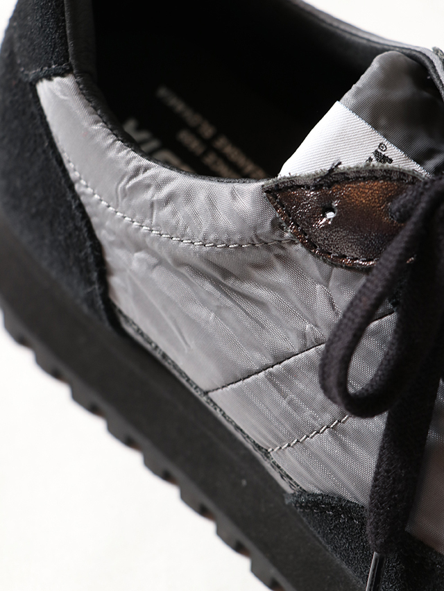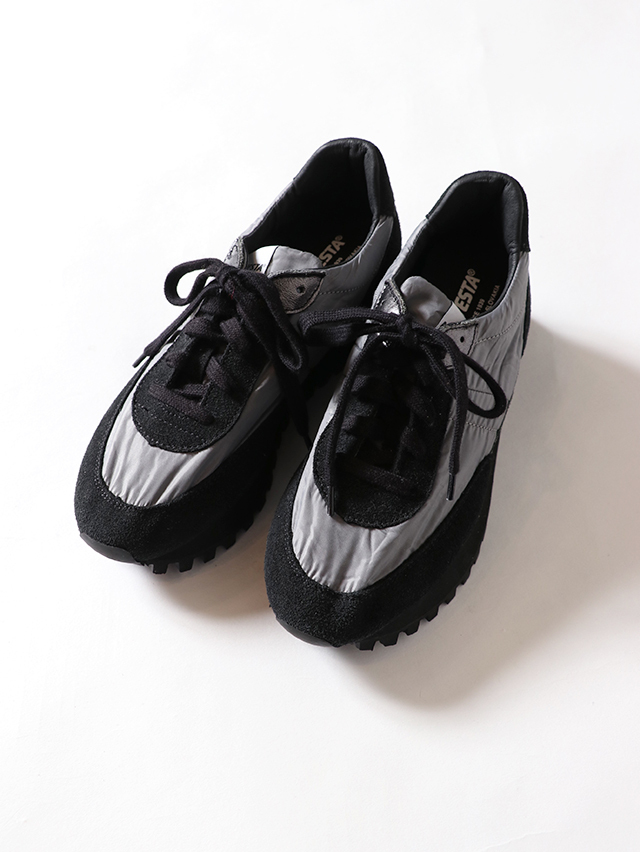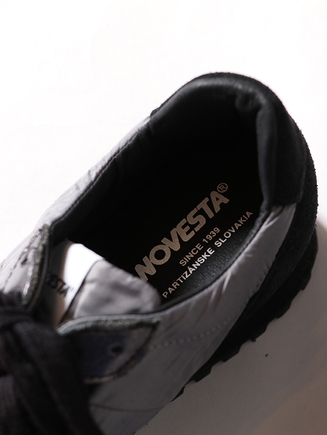 【NOVESTAより】ブラックとグレーのコンビネーションに一部メタリックレザーを使用したビビッドなデザイン。1970年代に中央・東ヨーロッパで生産されていたランニングシューズにインスピレーションを受けて作られたランニングシューズモデル "MARATHON RUNNER"。MARATHONよりも更に軽量かつライニングは蒸れにくい合成皮革仕様。グリップの良いTRAILソールを厚底にしたSUPER TRAIL仕様。1980Sを感じるレトロな素材感と現代的な心地よい着用感が特徴です。