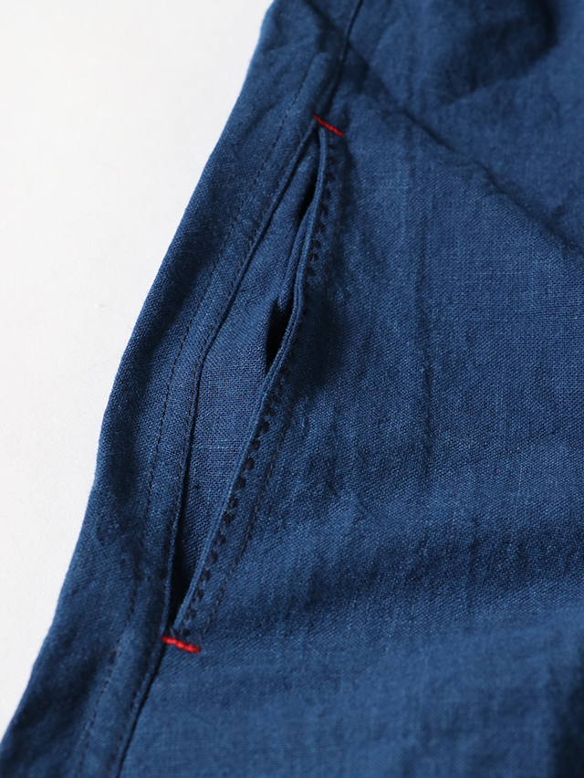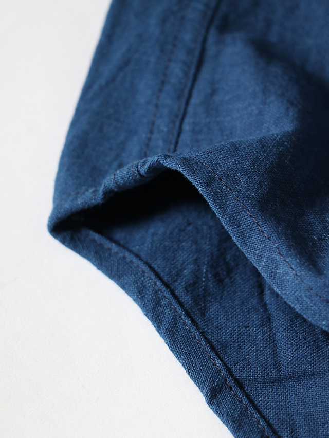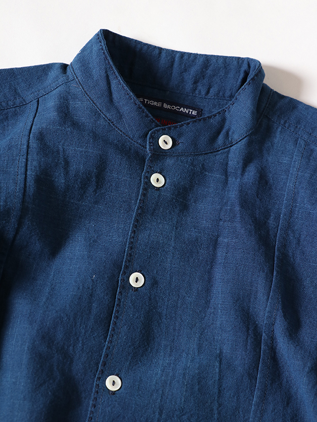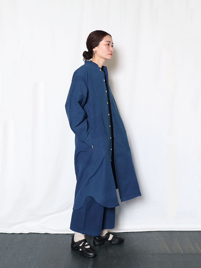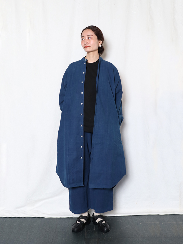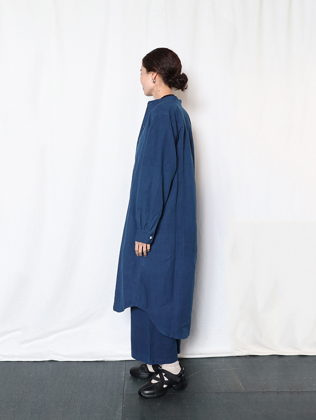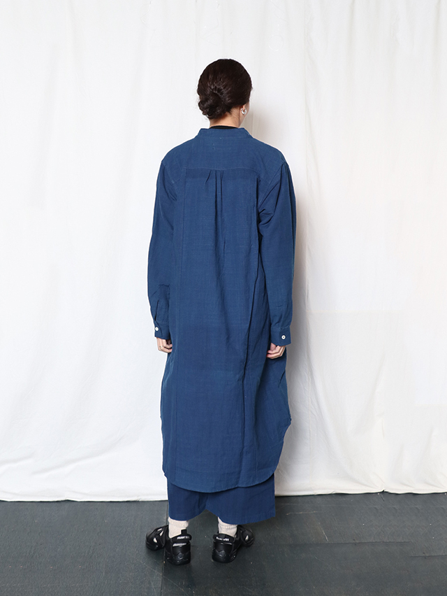 タイ北部・チェンマイ県にあるホート群にて作られている生地。手紬手織りの為、均一でない独特な織りムラや温かみのある風合いが特徴です。昔ながらの手織りで1日に7〜8m程のペースでゆっくりと織られています。糸は現地の藍染で6回"かせ染め"(糸を束ねて染める伝統的な染色方法)を繰り返し、色を出しています。かせ染めは一日に一回しか行えず、糸染めにも長い時間がかかります。形はすっきりとしたスタンドカラー、裾がラウンドしたデザインのtomboyシャツがワンピースとして登場。ちょっとした羽織にもおすすめです。サイドがくりぬかれ、まずは軽やかに一枚でさらりとどうぞ。