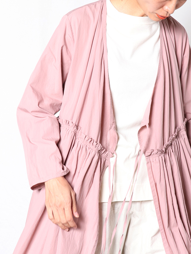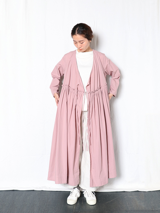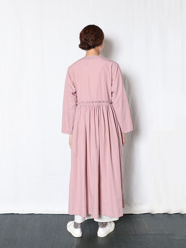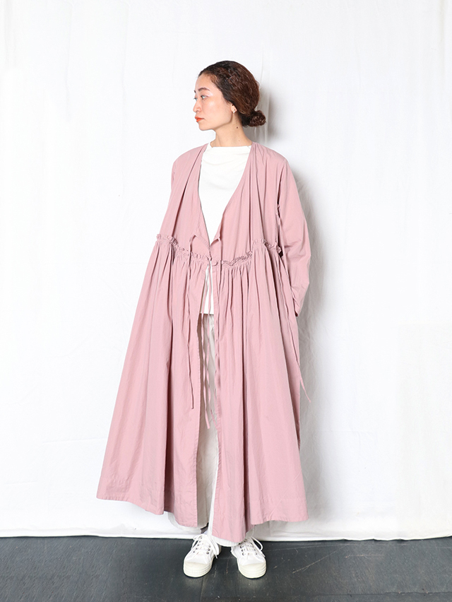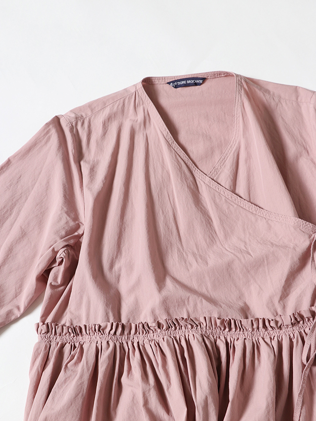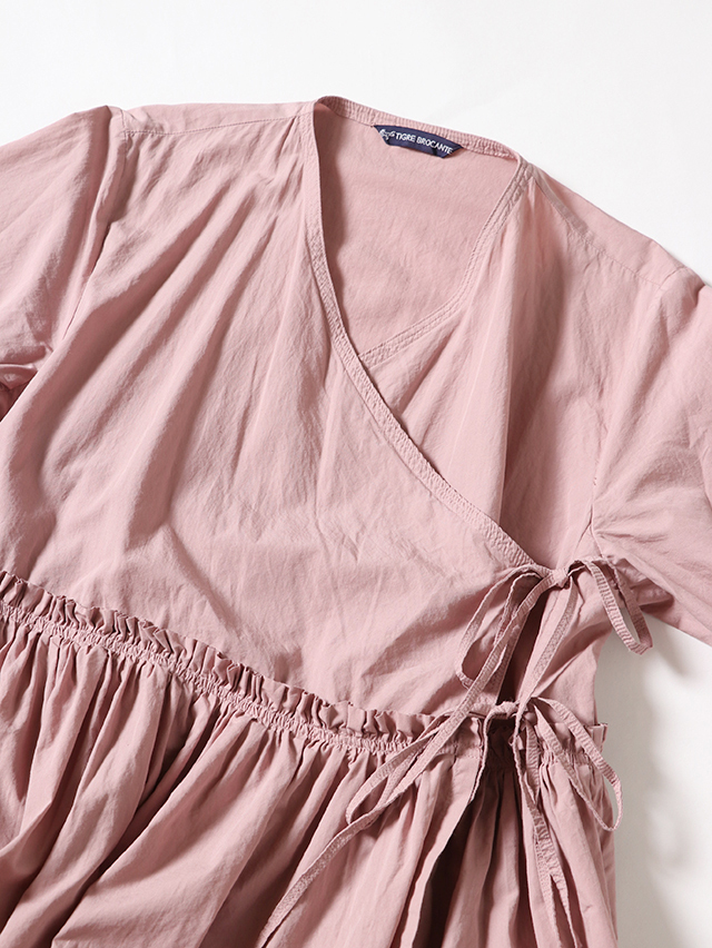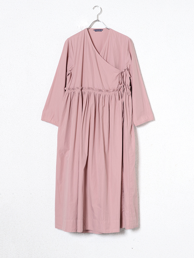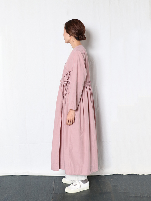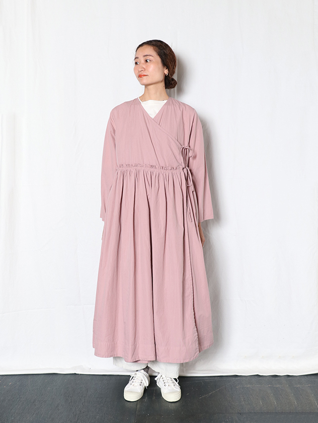 細い糸で高密度に織られた滑らかなブロード生地で新作ワンピースを仕立てました。形はがカシュクールのガウンタイプ。ギャザーがたっぷりと入り、切り替えからふわっと広がるデザイン。内側と外側に紐が付いており、一枚でももちろん羽織として、様々な着方を楽しめる一枚です。