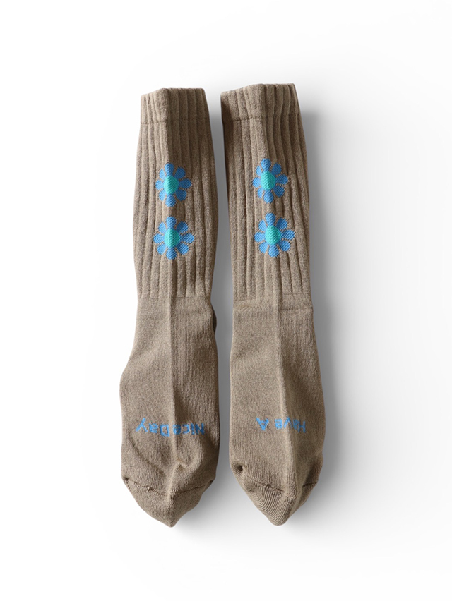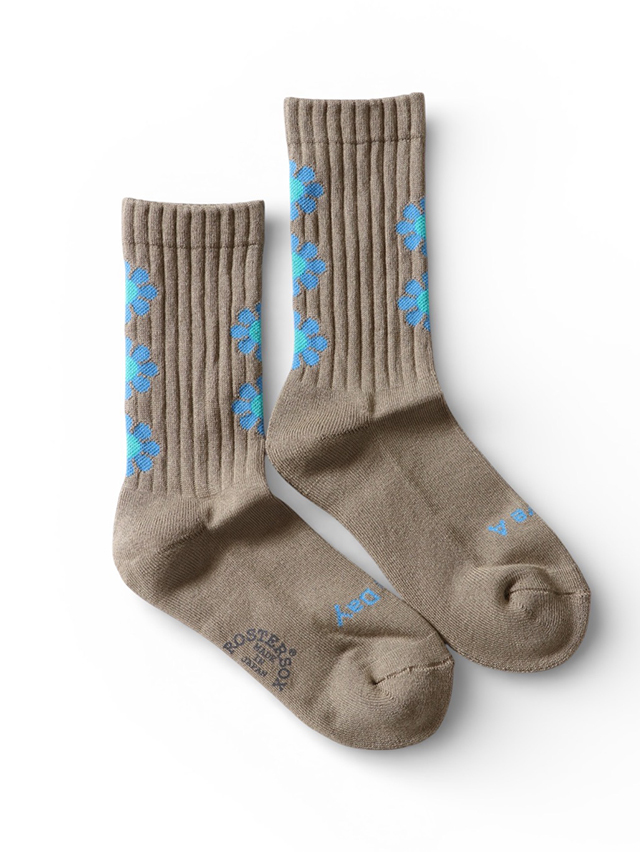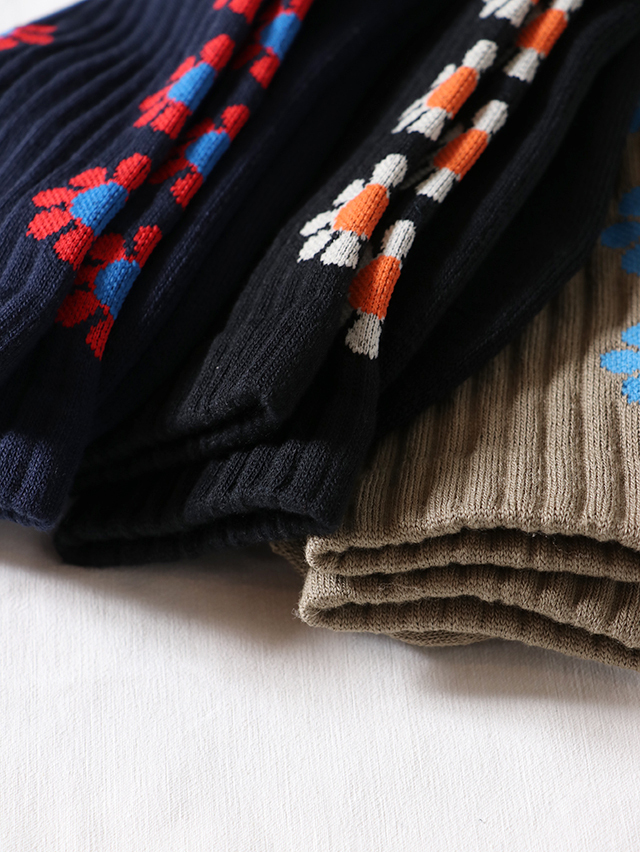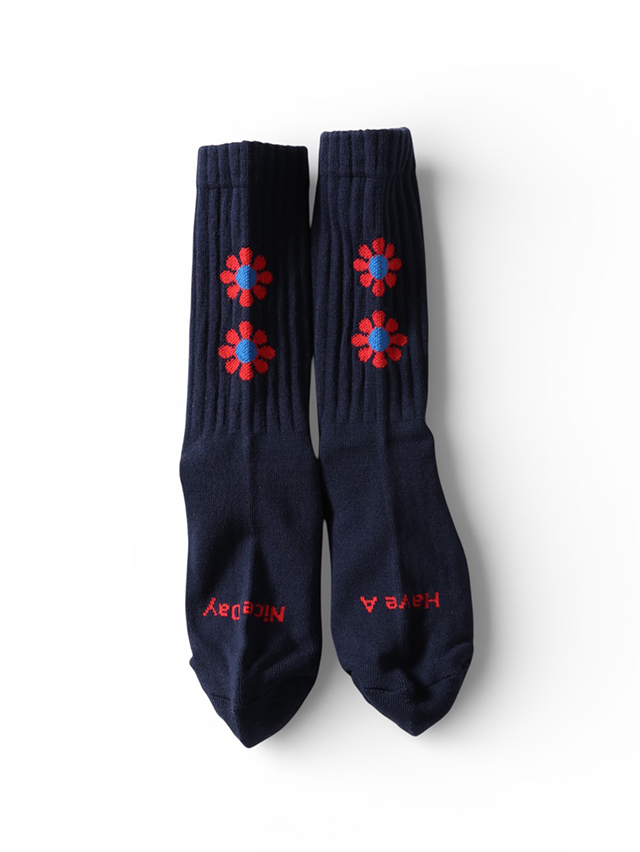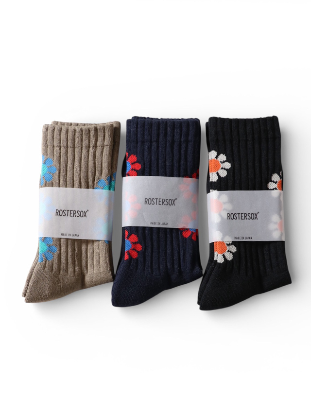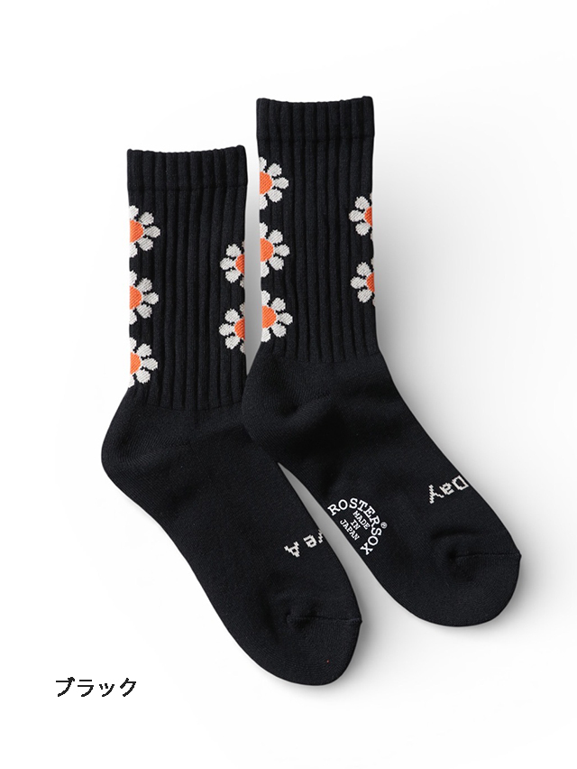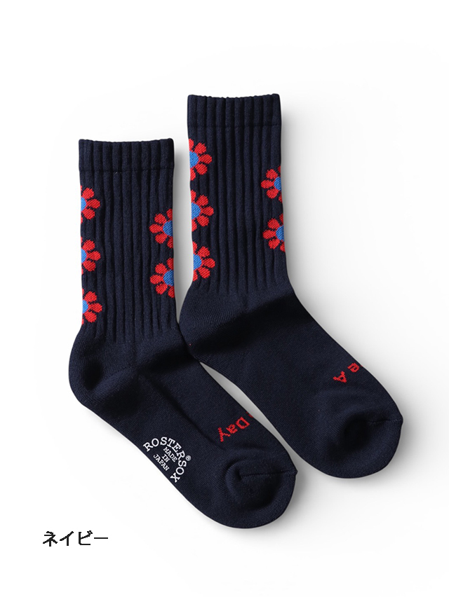 【ROSTER SOX /ロスターソックス】より お馴染みのフラワーパターンを散りばめた、ピースフルなデザインソックス。 つま先部分には “HAVE A NICE DAY” のメッセージ入りで、履くだけで気分もアップ。 カラーは〈ブラック〉〈ネイビー〉〈オリーブ〉の3色展開。ボディカラーに合わせた花柄の色合いがコーディネートをさりげなく華やかにしてくれます。 スニーカーやサンダルとも好相性で、デイリーに活躍する一足です。