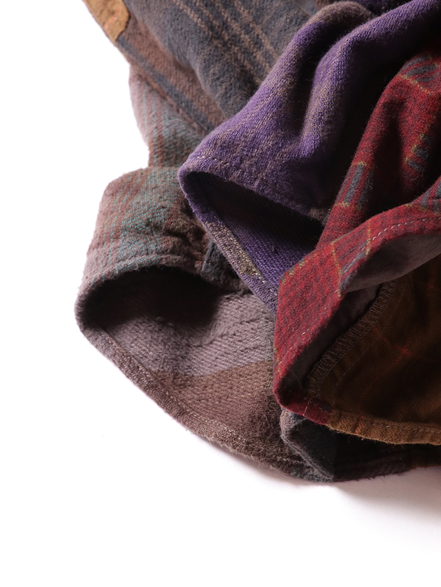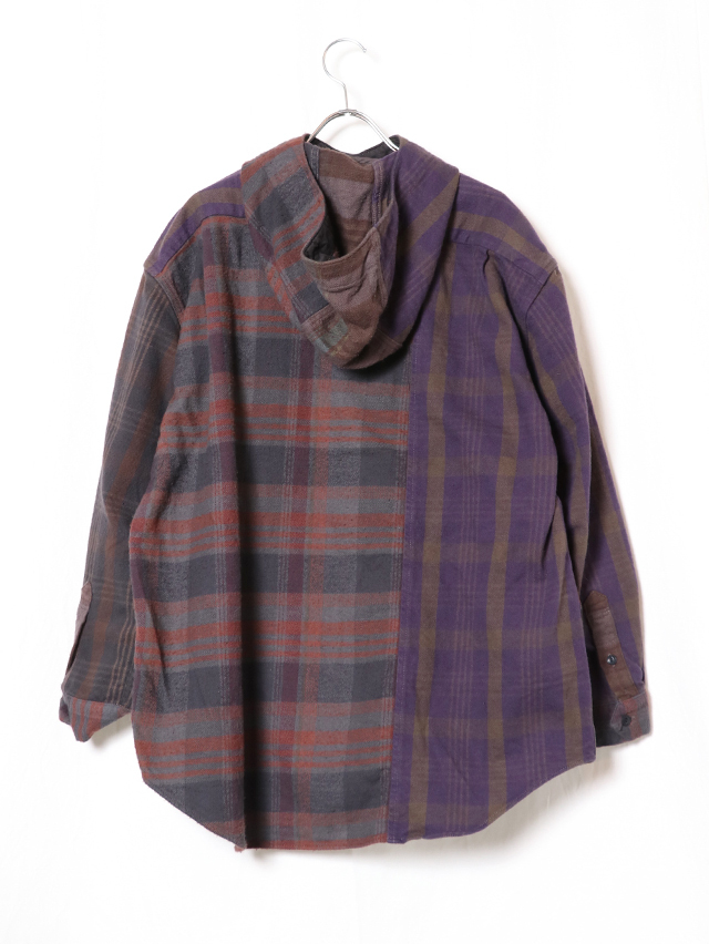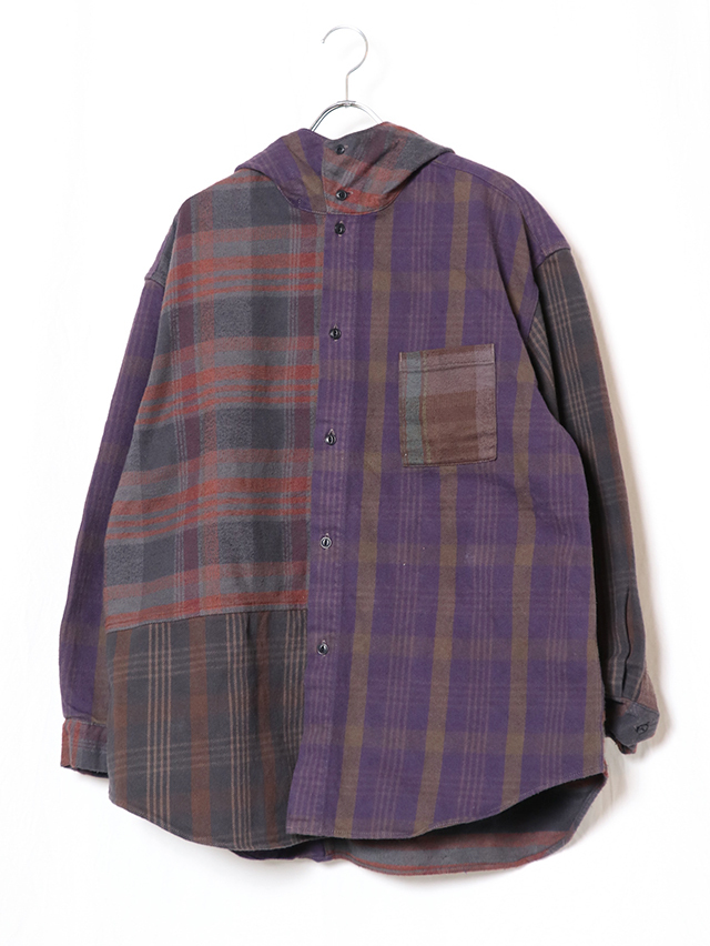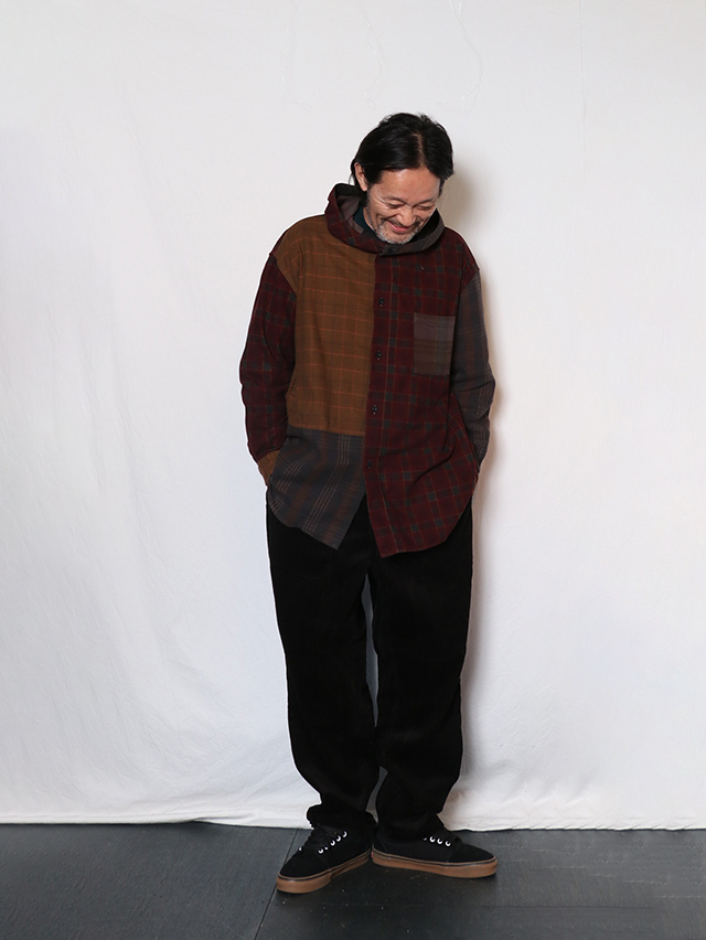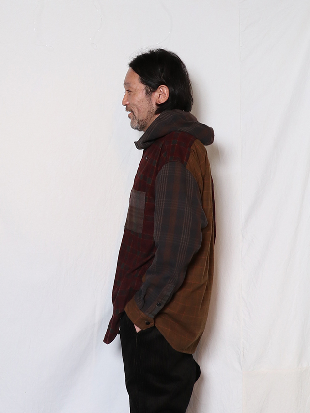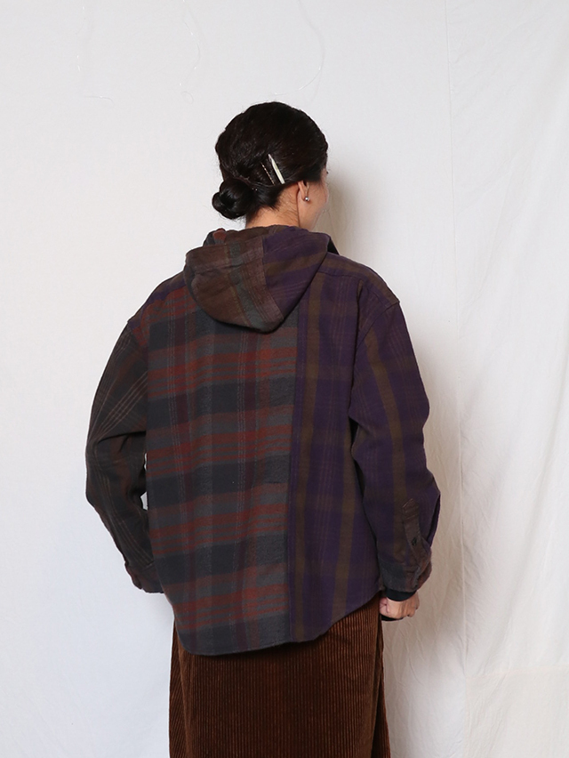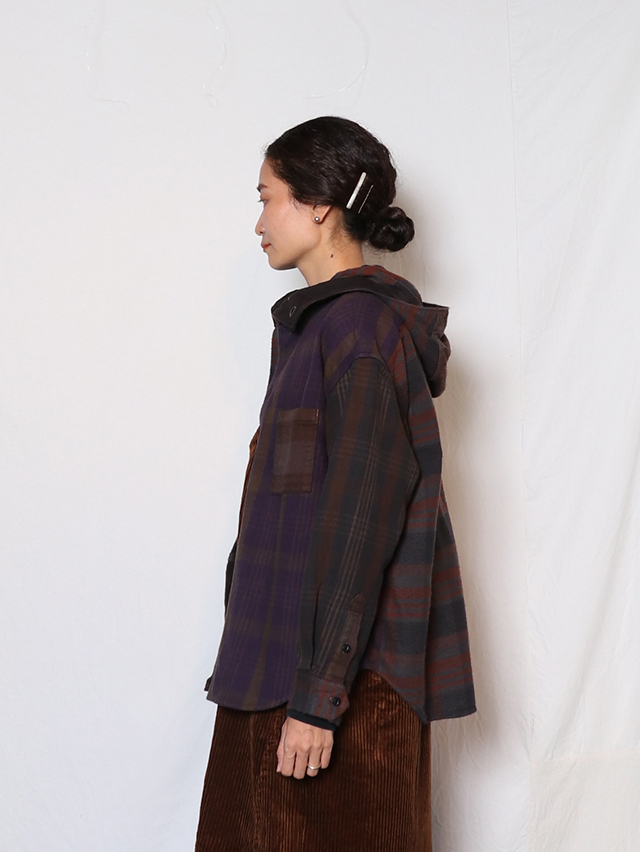 身幅はゆったりと、裾はラウンドしたシルエット。羽織でアウターライクにも使える万能な型。ボタンを全て閉めてインナーのアクセントとしても◎。素材はオリジナルのチェック生地、異なるチェックの生地を組み合わせ。合間の季節に楽しめるシャツです。※着用は例です。実際の生地配置は1、2枚目の画像となります。