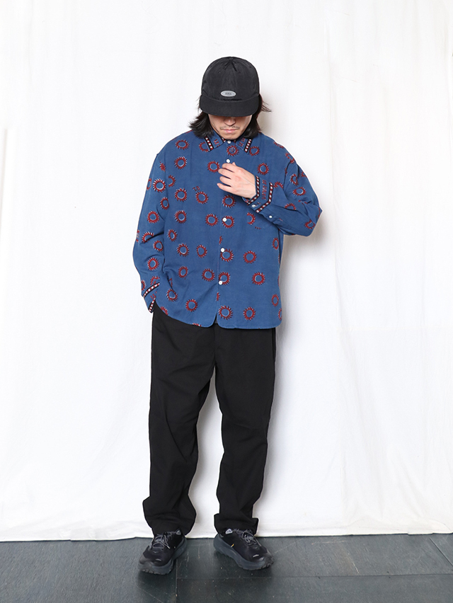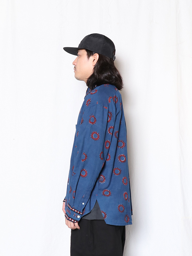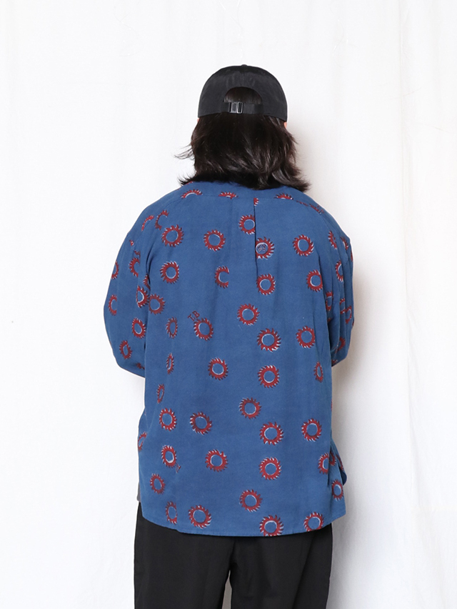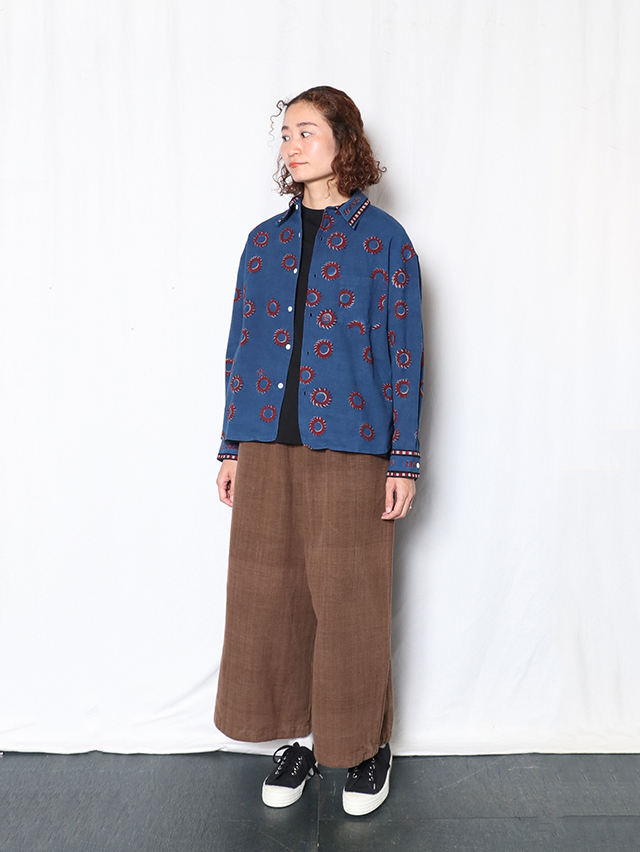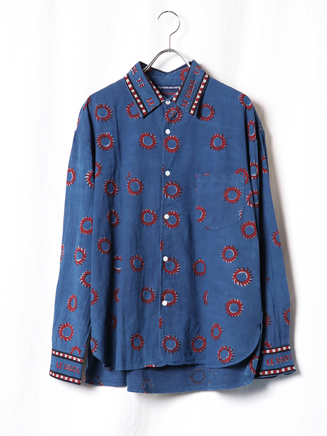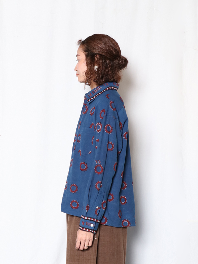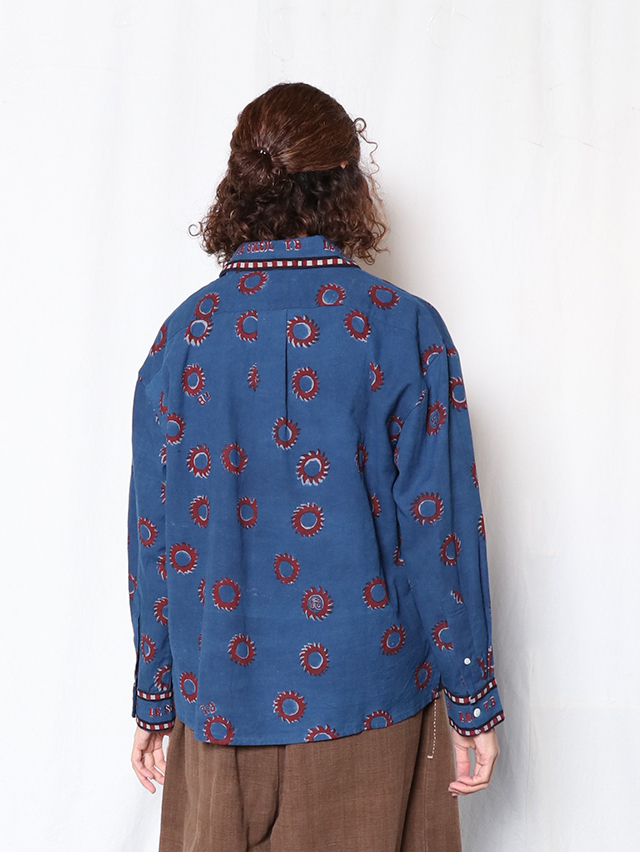 2025秋冬のブロックプリントは復刻デザイン、太陽デザインをブロックプリント用に再構成。縁取りのラインとロゴデザインを加え、アイテム毎にポイントになるよう配置しています。伝統的なDabプリントと呼ばれる手法でプリント。本藍とインディゴMIXの染料で染めています。柄をDab(泥)の防染糊で防染した状態で手染めし、防染糊を洗い落としてからカラー部分をプリントする手法です。ユニセックスアイテムのトップスはレギュラーワイドシャツをご用意しました。襟や袖部分には、T.BやLe Soleilの文字のデザインの柄になるよう配置しています。手作業ならではのズレやにじみ、素朴な温かみ、風合いをお楽しみ下さい。
