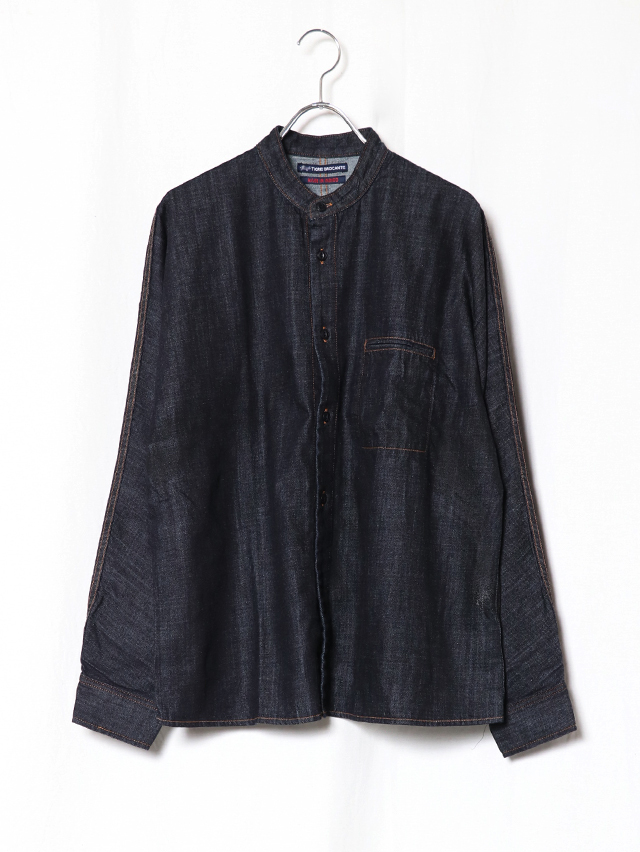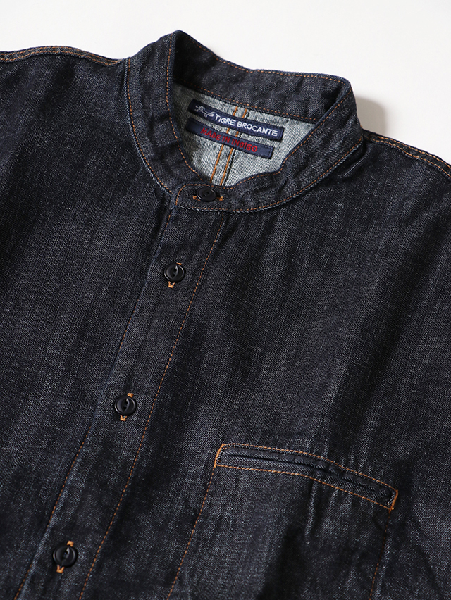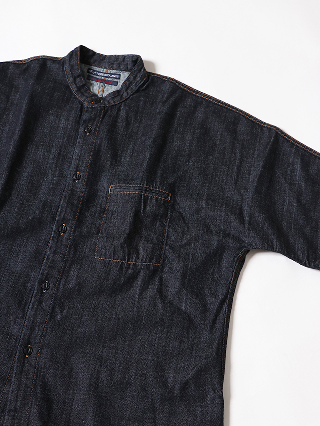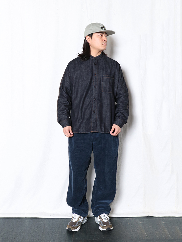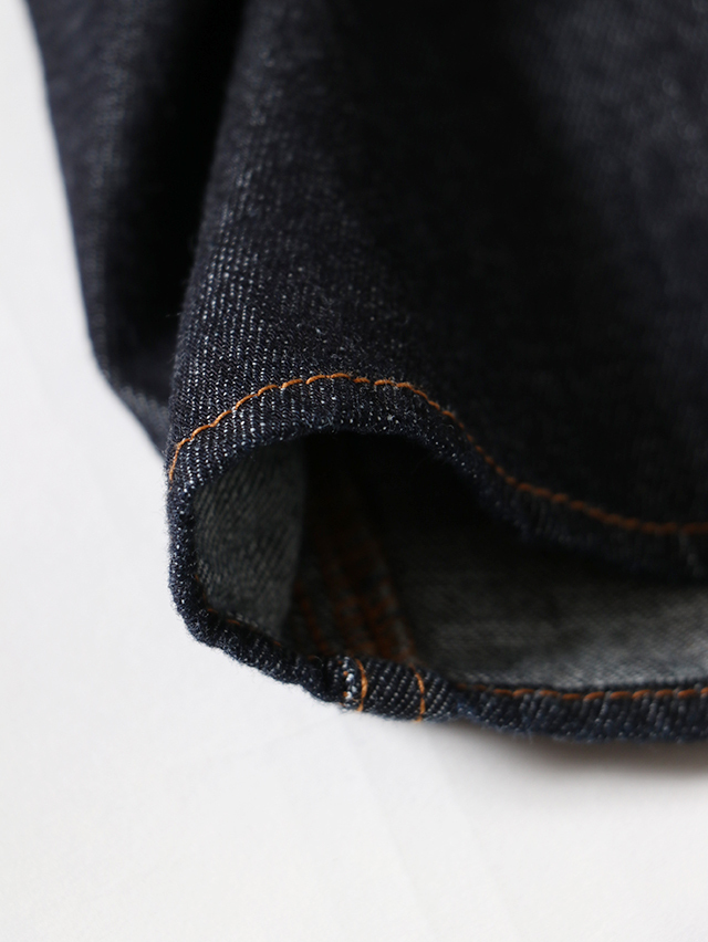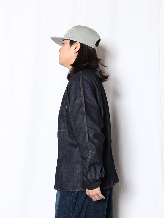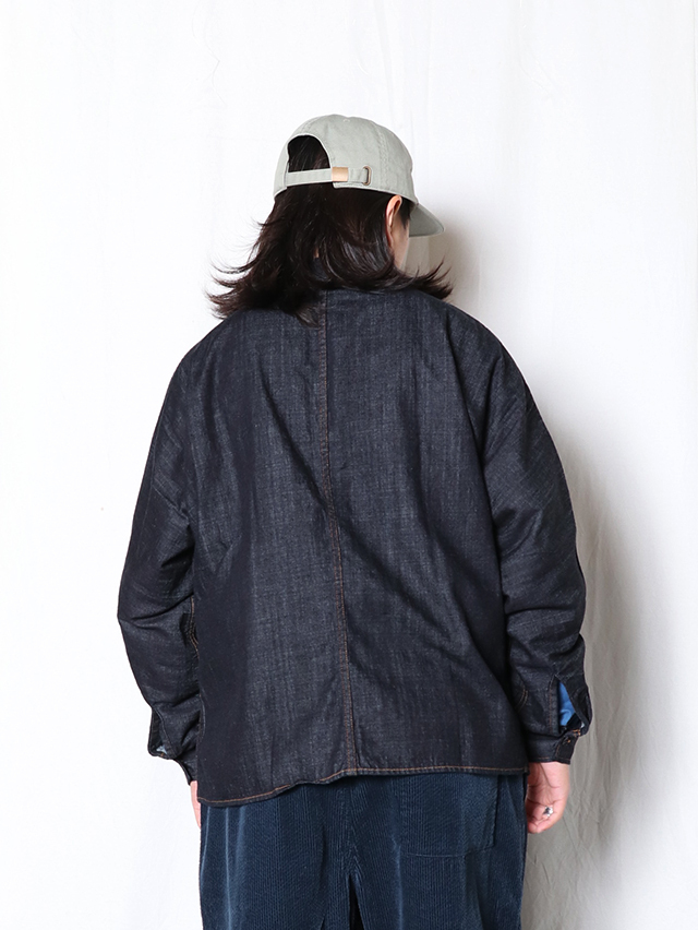 身頃とアームが繋がり、ストレスフリーな着心地のストールマン、スタンドカラータイプでご用意しました。素材は程良い厚さ7オンスのデニム。ややしっかり目の生地感はこれから秋冬の季節にぴったりの素材感です。