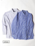 今季の新しい形であるFujinシャツ。裾にかけて動きのある新たなユニセックスロングシャツです。生地は爽やかなストライプでご用意しました。