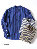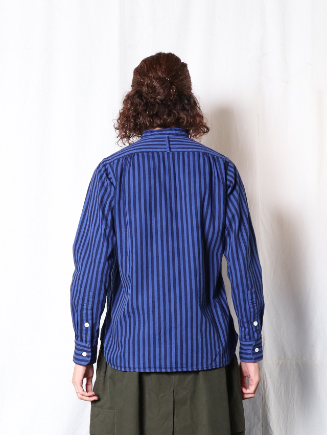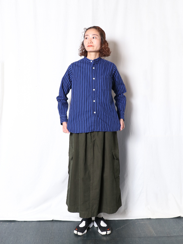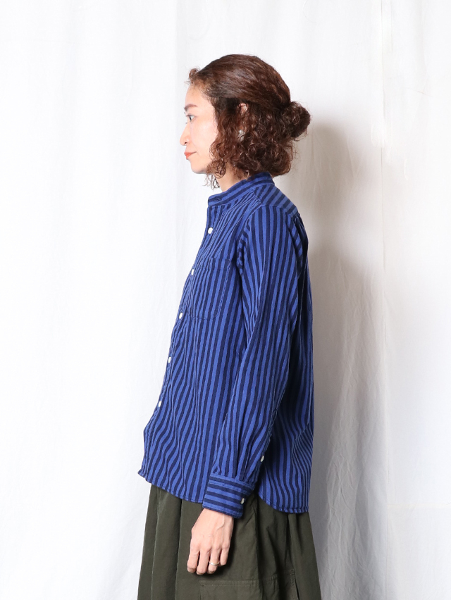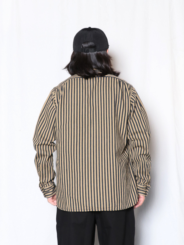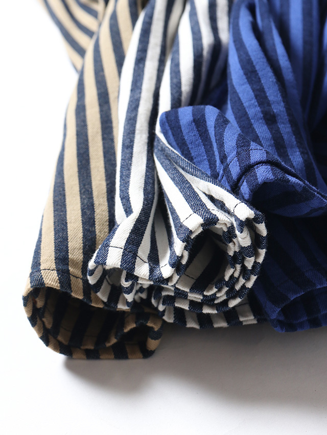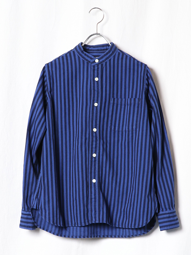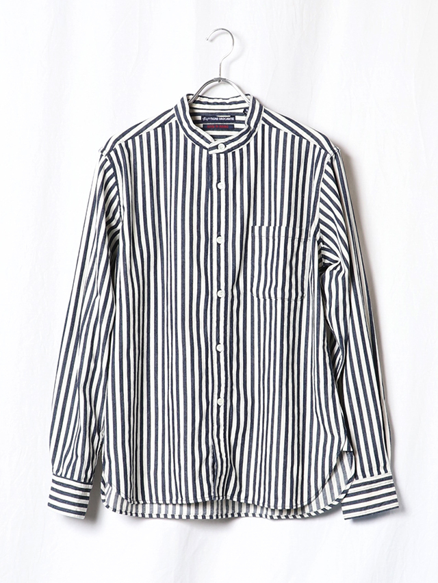 定番的人気、ヒッコリーストライプのスタンドカラーシャツ。ややしっかり目の生地感はです。スタンドカラーですっきりと、やや太めのストライプでクリーンとカジュアル、どちらのスタイリングにも合わせやすい一枚に仕上がっています。今回はインディゴと染めカラーの2色でご用意しました。
