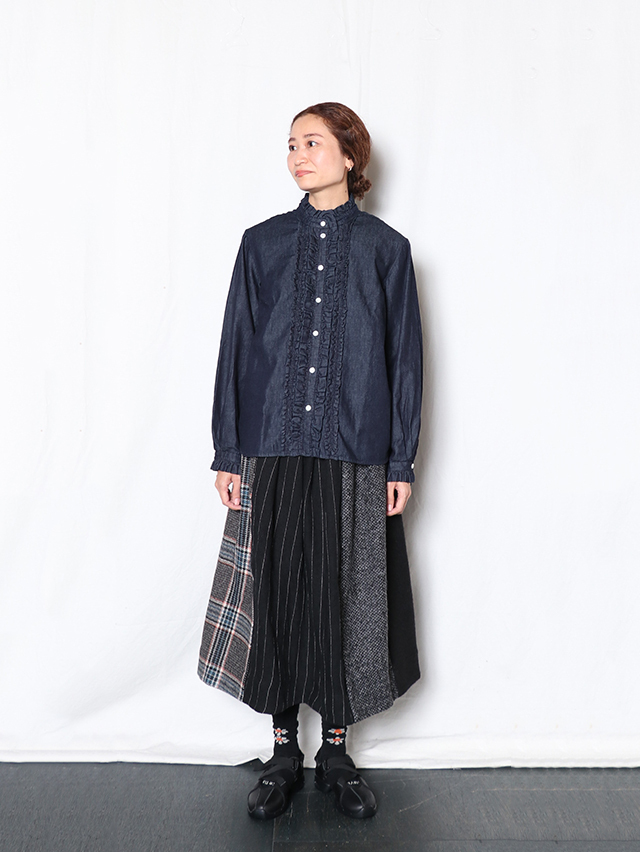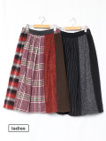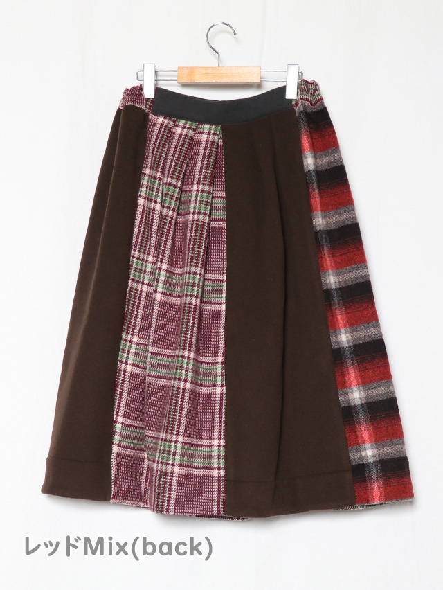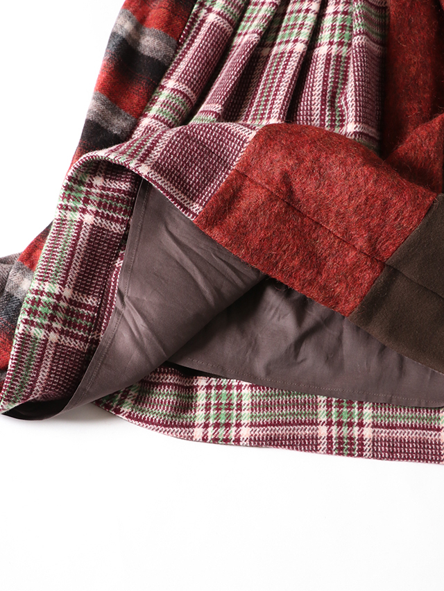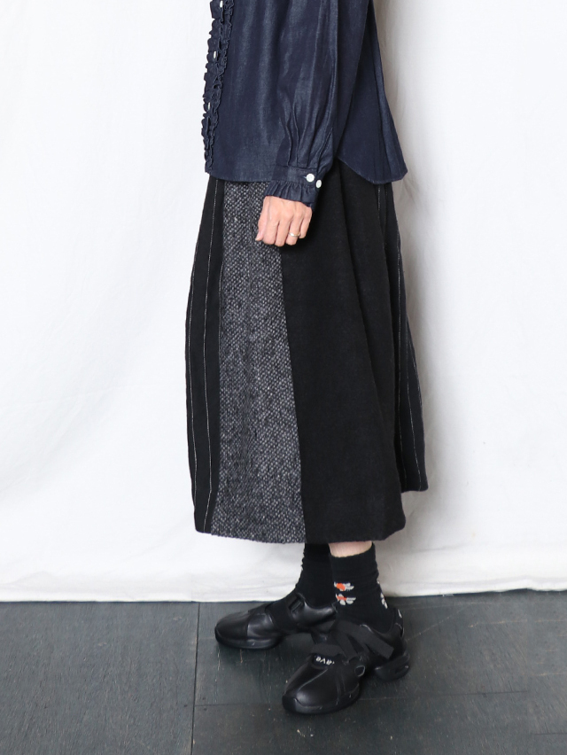 様々ウール素材を組合せたスカートをご用意しました。前後サイドにタックが入り、広がりを抑え、カジュアルかつ上品な形。ウール生地の組合せですが、重量感なく裏地付き。秋冬のアクセントになる一着です。