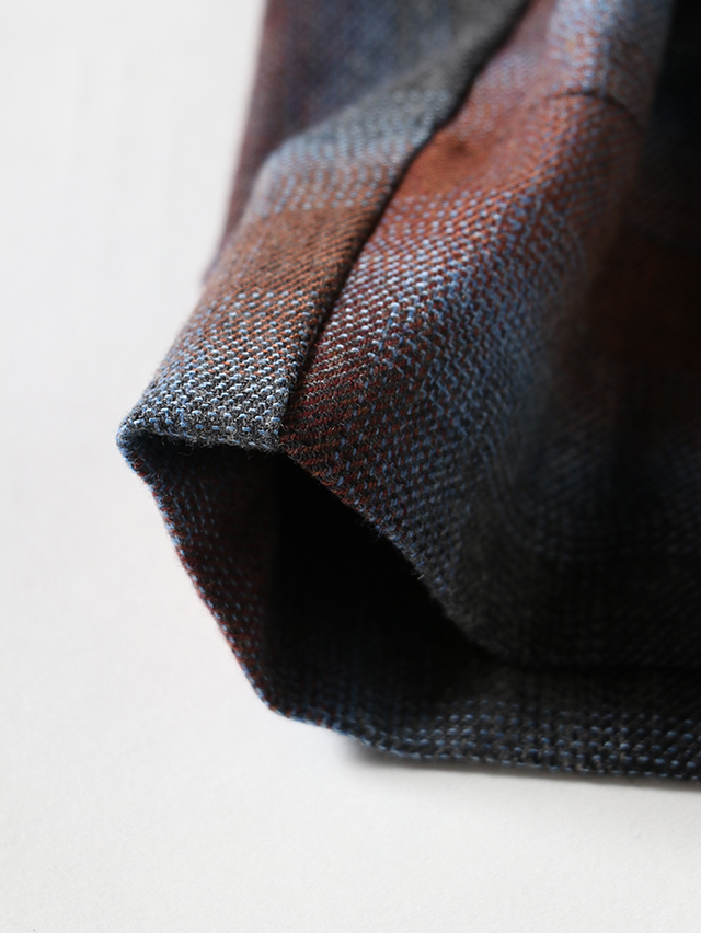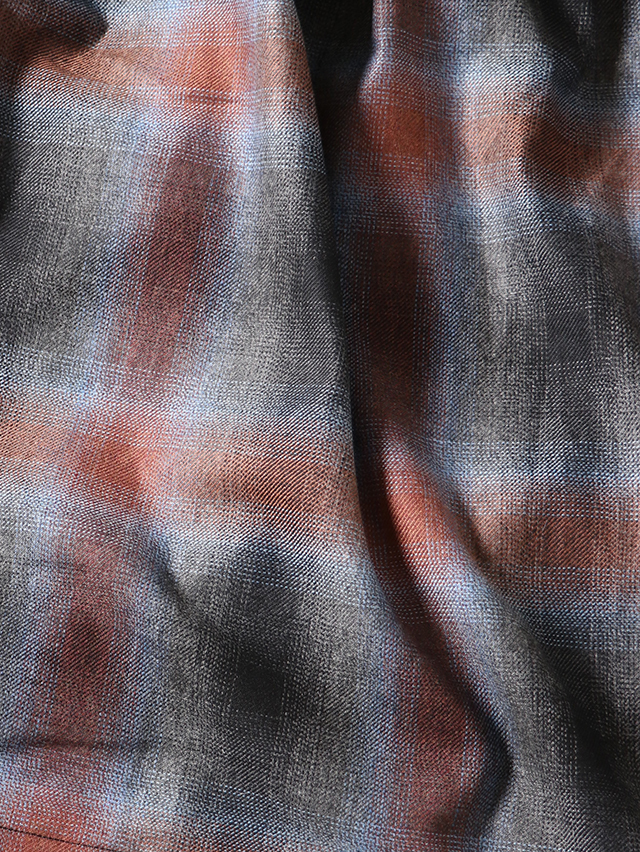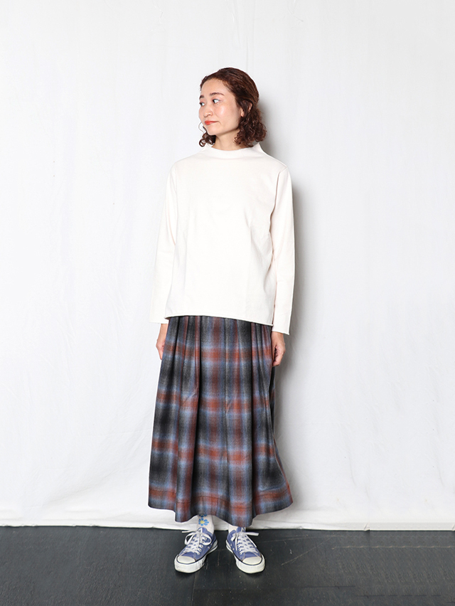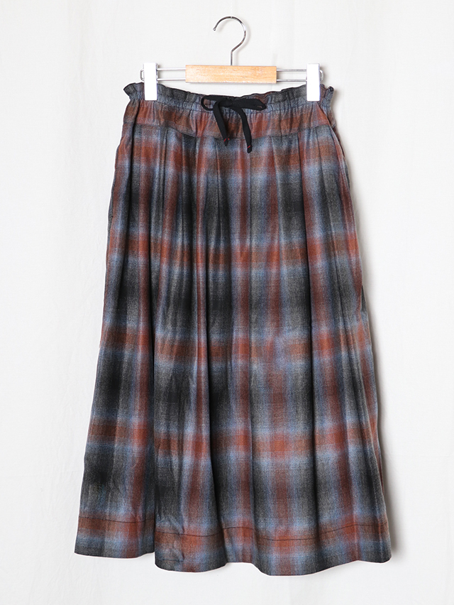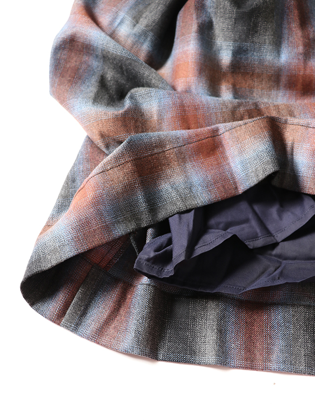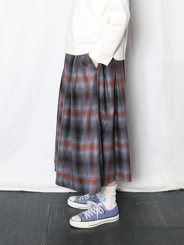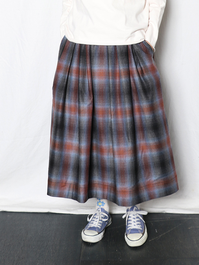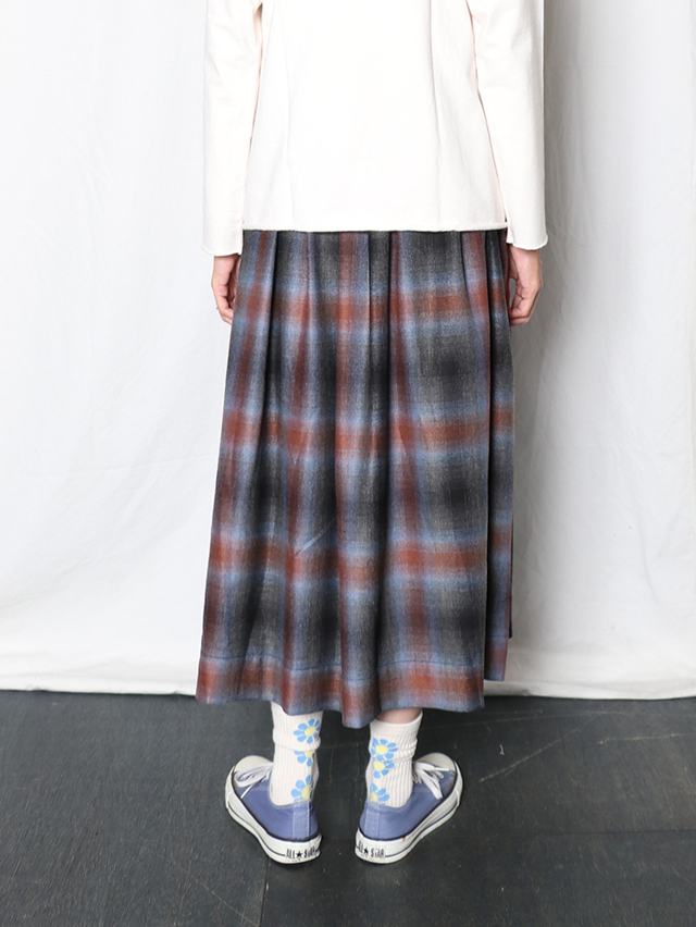 オンブレウールチェックは、色に濃淡があるグラデーション状のチェック柄が特徴の、上質なイタリア製ウール生地です。形は定番のフィセルロングスカート。キュプラ素材の裏地が付いています。秋冬の装いにおすすめの一枚です。