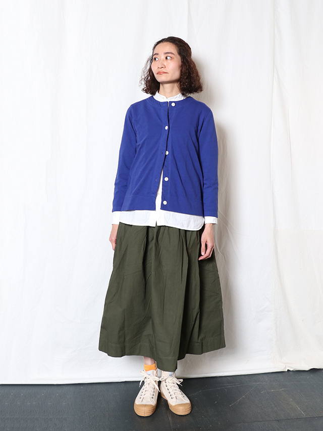 繊維の長い綿を使用し密度を高く織った素材で製品染めを施しているため、自然な染めムラ、アタリ(色落ち)が見られます。ワークテイストな製品の雰囲気をお楽しみ下さい。