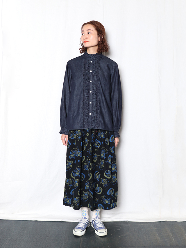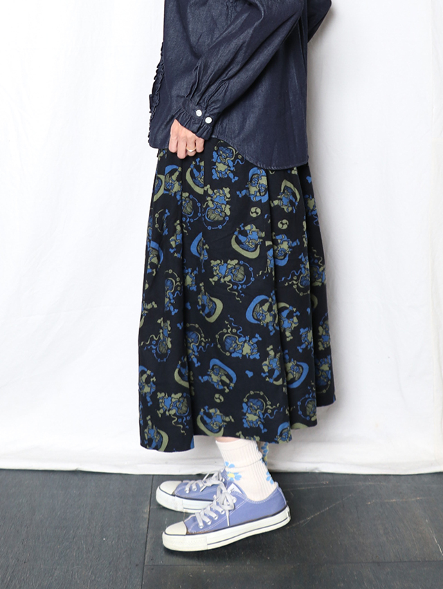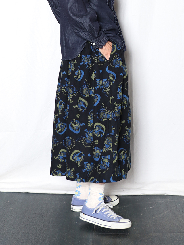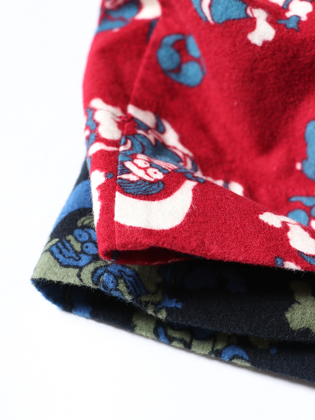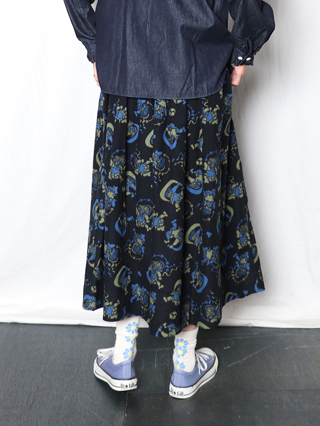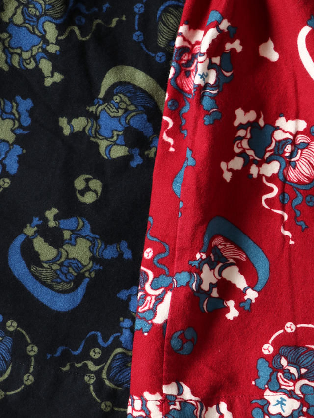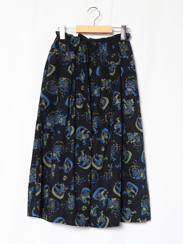染色家・石北有美氏デザインの2025秋冬コラボ柄は、五穀豊穣や自然への感謝、災害なく穏やかな未来を願い、人間の傲慢さを戒め、自然と力と調和の象徴である風神雷神をモチーフ。フランネル素材に手捺染プリントした生地。 形は定番のフィセルロングスカート。ハンドプリントで生地全体にモチーフを刷っていく、昔ながらの手捺染の技法で仕立てた生地プリントで出来上がりました。