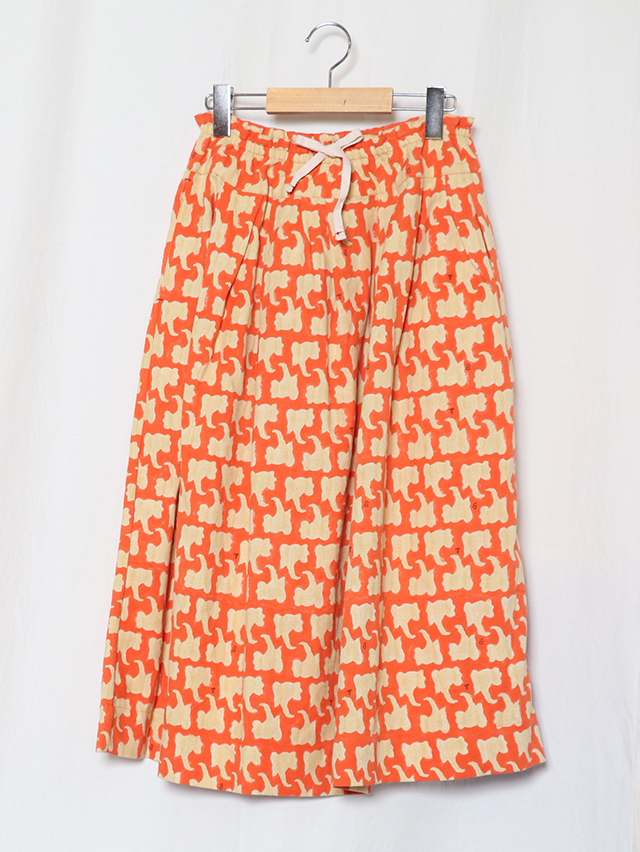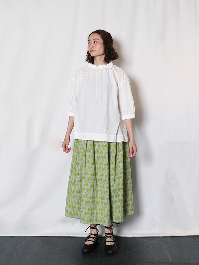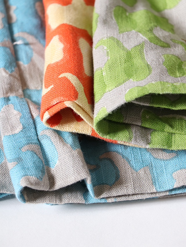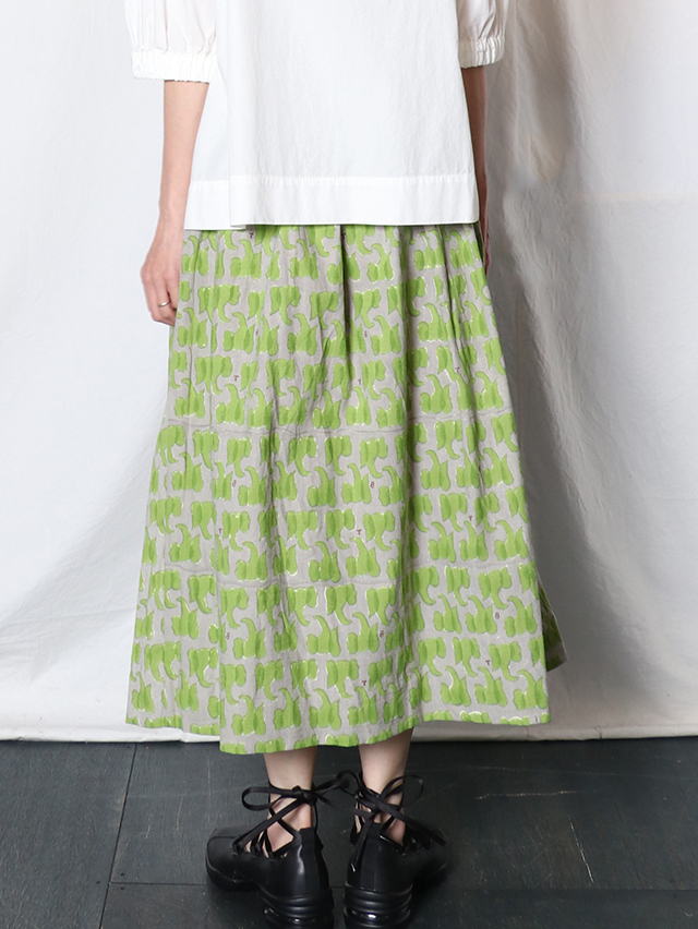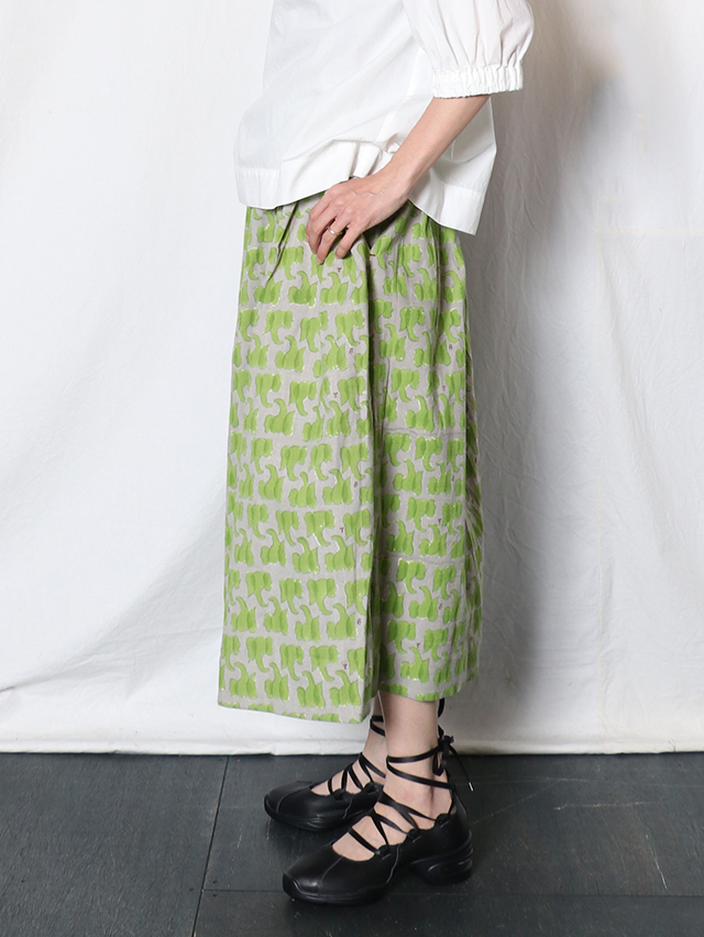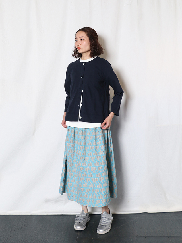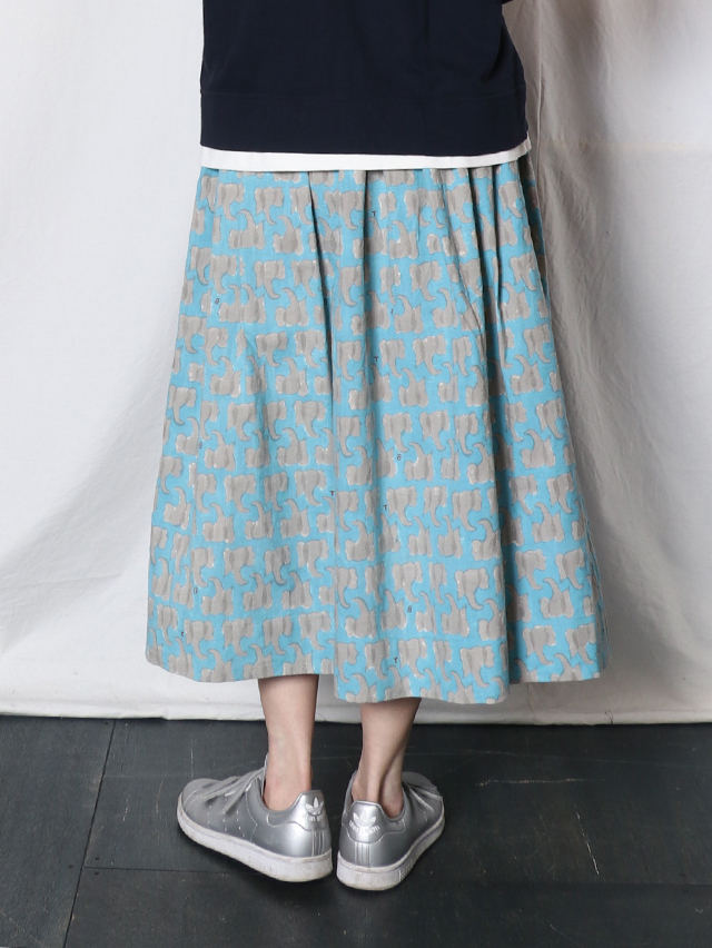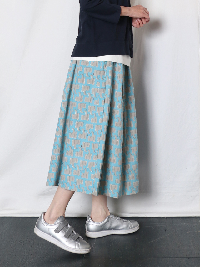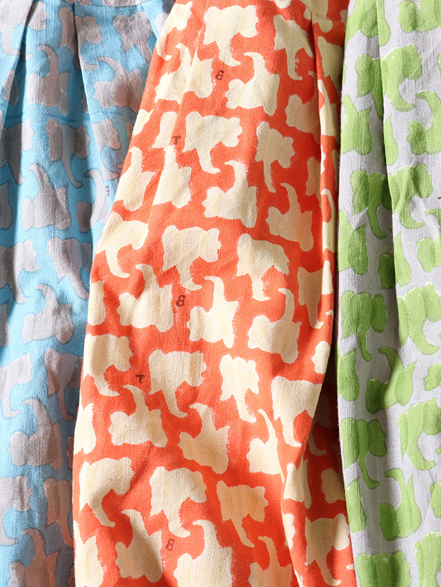染色家、石北有美氏とのコラボファブリック。ゾウが 連なって、ゆったりと歩く可愛らしい様子を模様に。ティグルオリジナルの春夏らしい温かみのあるカラーリング、3色をご用意しました。形は定番のフィセルロングスカート。ブロックプリントの版の重なりを生かし、象モチーフを表現しており、手作業ならではのズレやにじみがポイントです。