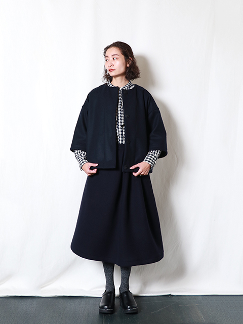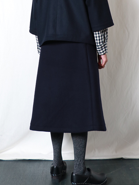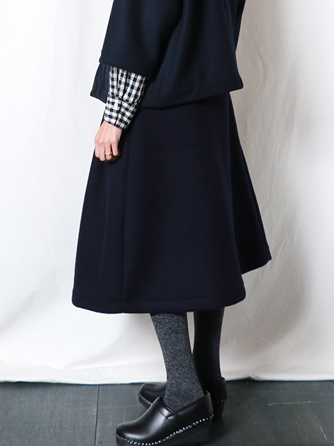 厚手ながらも軽くて暖かなダブルフェイス生地を使い、Aラインスカートを仕立てました。ウエストにタックが入り、生地感もあって上品な印象に仕上がっています。