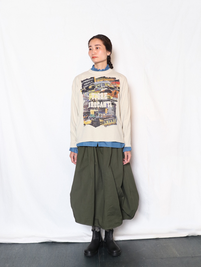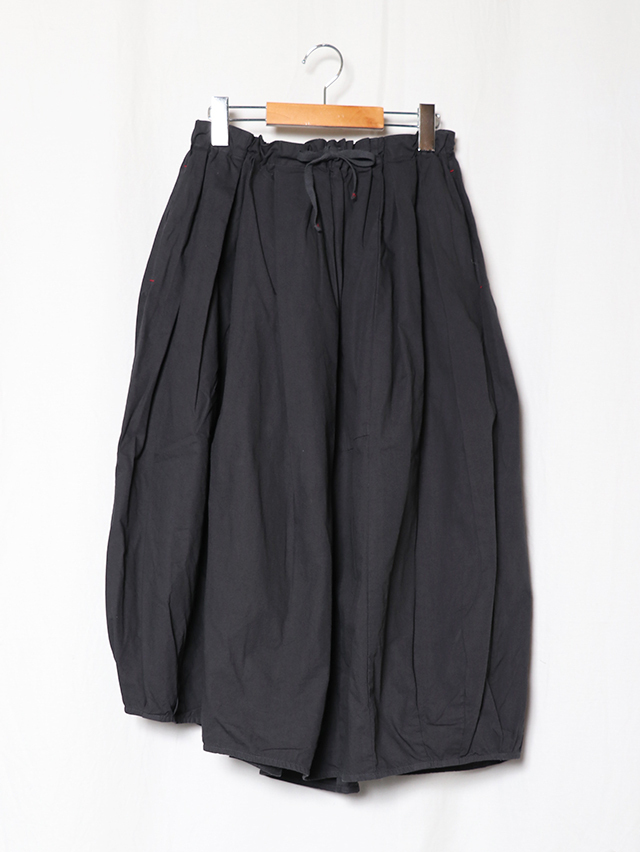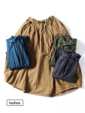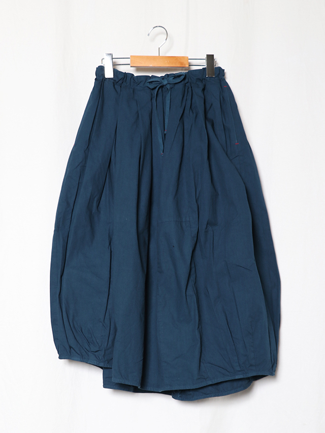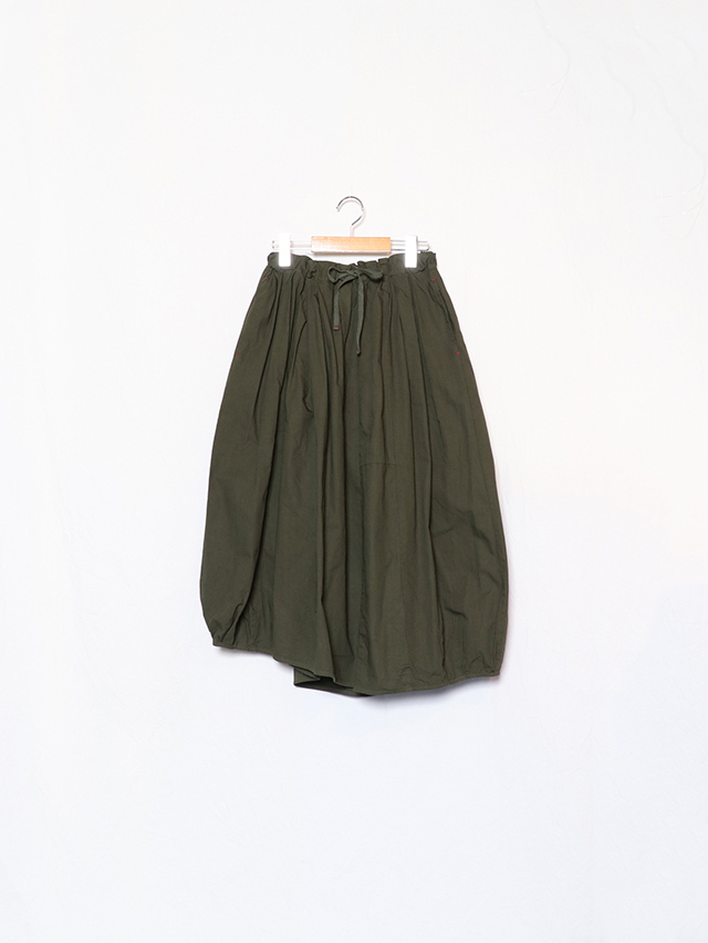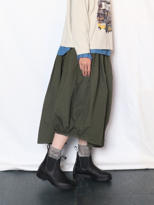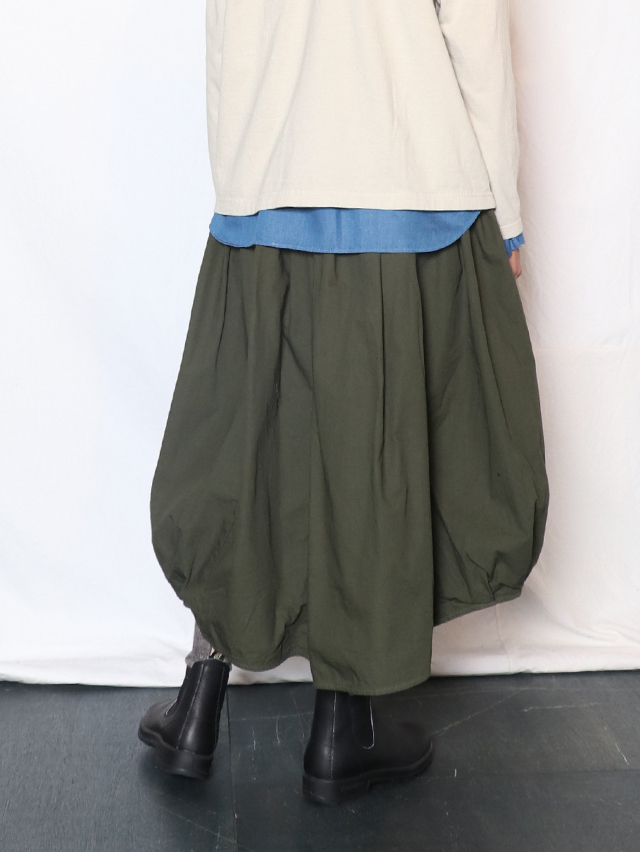 アシンメトリーな斜めの裾が特徴的なバレルスカート。たっぷりと入ったギャザーにでふわりと。裾にはタックが入り少し丸みを帯びたバルーンライクなシルエットになっています。素材は定番人気のジンバブエコットンを使用、ハリのある生地感はヘビーローテーションにも耐えうる安心感。季節問わずお楽しみ頂けるアイテムです。