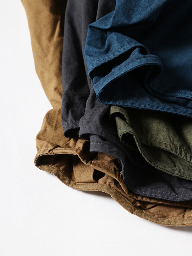 繊維の長い綿を使用し密度を高く織った素材で製品染めを施しているため、自然な染めムラ、アタリ(色落ち)が見られます。ワークテイストな製品の雰囲気をお楽しみ下さい。