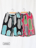 染色家 石北有美氏とのコラボファブリック。タイで見た大きなバナナの葉がモチーフの“南国の葉”。タイ・チェンマイで一柄一柄手描きされ、ろうけつ染めをしています。 特有の、柄のひび割れや表情を楽しめるファブリックです。形は暑い時期にも快適なショートパンツ。ウエストは紐での調整となります。