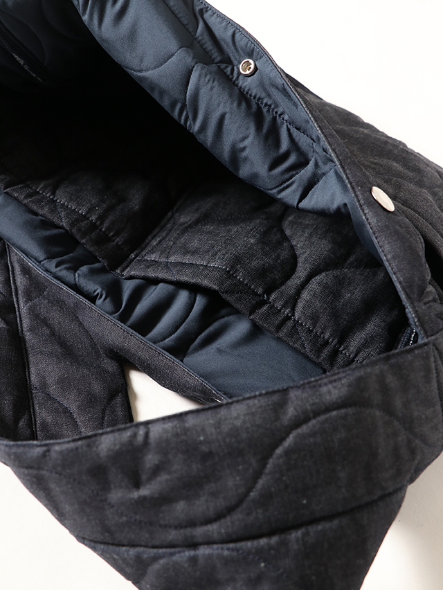 人気のデニムキルティング生地から作るメッセンジャーバッグ。開口部はスナップボタン仕様になっています。肩紐は幅広く安定感があり、外側と内側に仕切り付きのポケット付いた使いやすいバッグです。