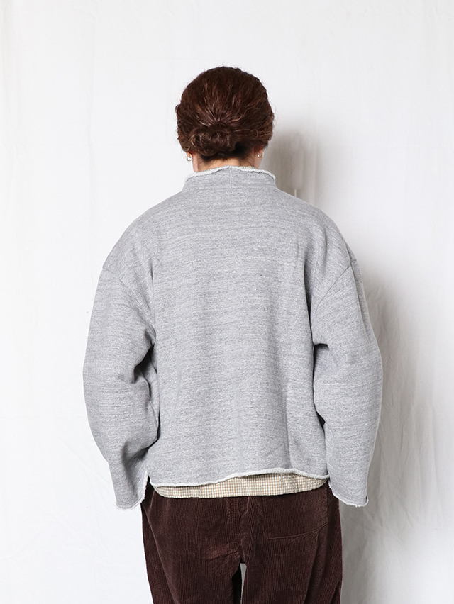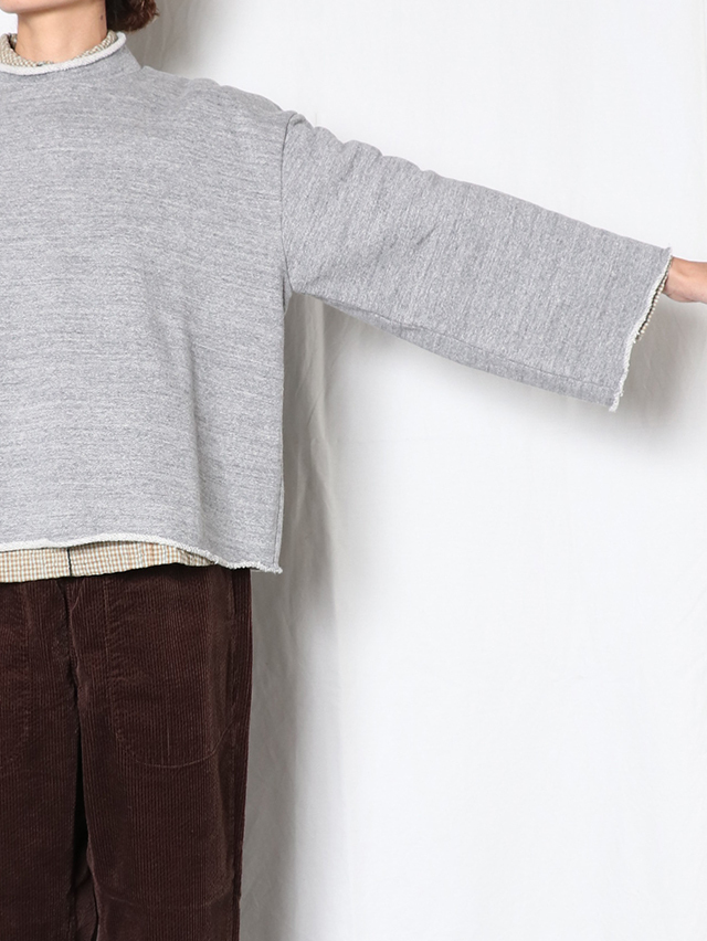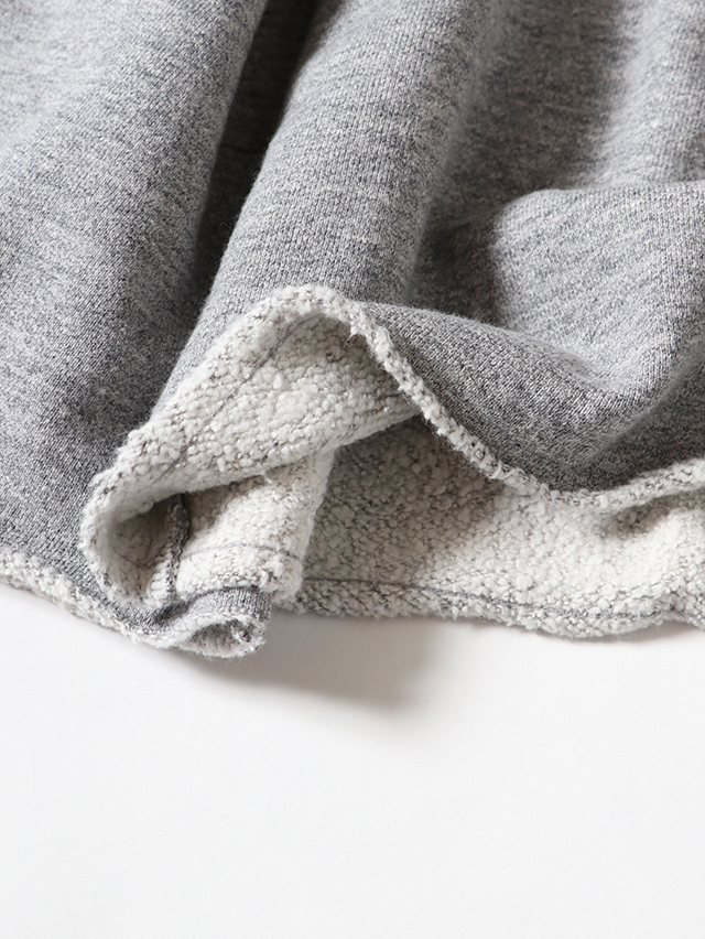 60年代の古着の裏毛、特有の起毛感を再現したオリジナルの素材で作るスウェット。生機の状態で裏に起毛をかけその後、染色とタンブラーを行い、表現しています。表糸を杢に変更し、オリジナルの杢裏毛が出来上がりました。新しい型のレディーススウェット。ワイドなシルエットにカットオフのデザインが特徴的な一枚です。柔らかな風合いをお楽しみください。