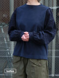 透け感あるレース素材とカットソー生地を組合せた長袖Tシャツ。袖はパフスリーブで、たっぷりとした袖元も可愛らしい一枚です。首元の開き具合は程よく上品に。ふわりと軽い着心地は、シーズン長く使える一着です。
