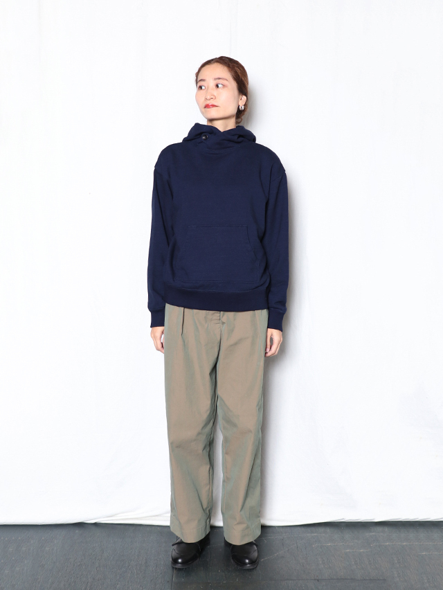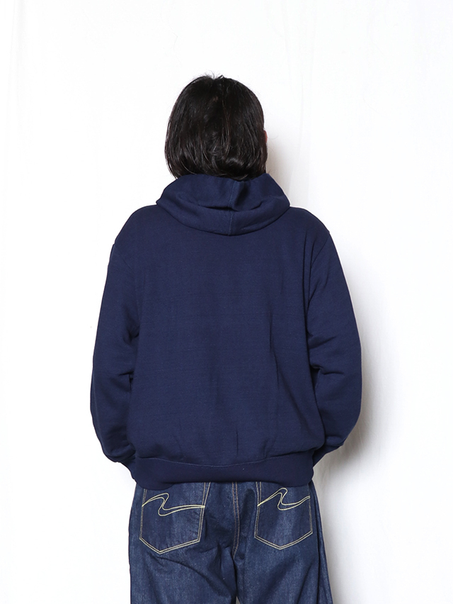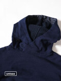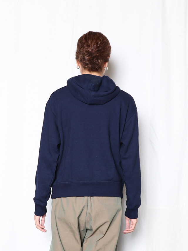 糸を摘みたての状態まで戻す紡績方法、昔ながらのロープ染色の手法で染めたオリジナルのインディゴ裏毛生地。 ライト裏毛生地でパーカをご用意しました。首元はボタンを付けて着方は様々に。アウターと合わせてもすっきり着れるサイズ感に仕上がりました。