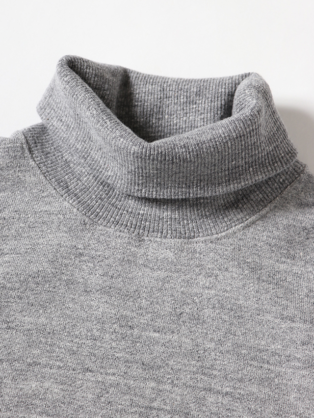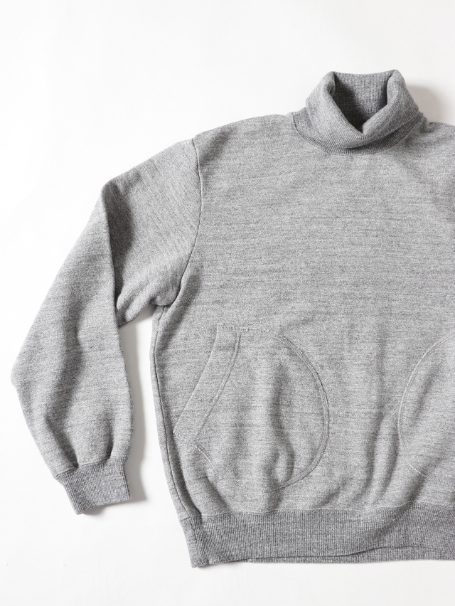 60年代の古着の裏毛特有の起毛感を再現したオリジナルの素材で作るスウェット。生機の状態で裏に起毛をかけた後、染色とタンブラーを行い、表糸を杢に変えたオリジナルの杢裏毛。形はタートルネックとパッチポケットが特徴のスウェットをご用意しました。首元のフィット感、コンパクトなサイズはアウターに響かず、あたたかさも兼ね備えた一枚です。