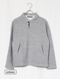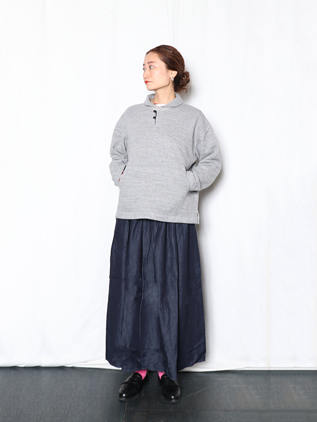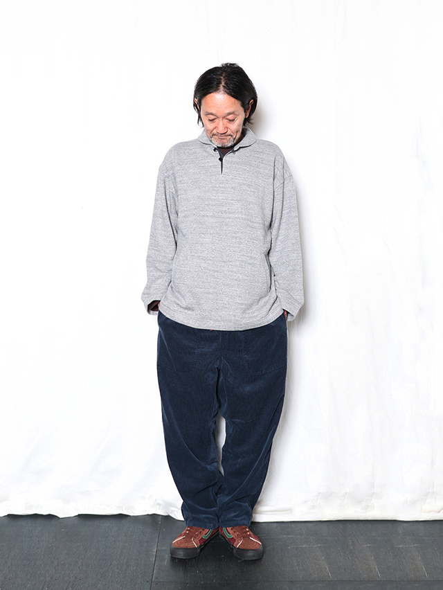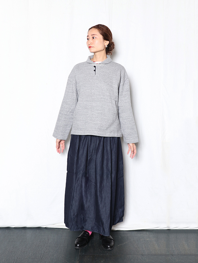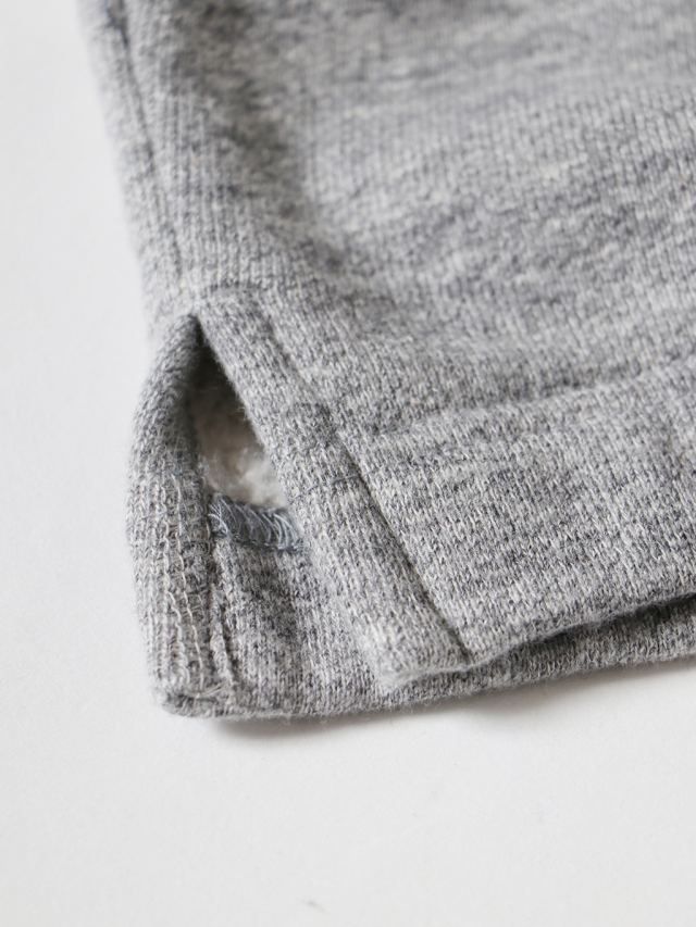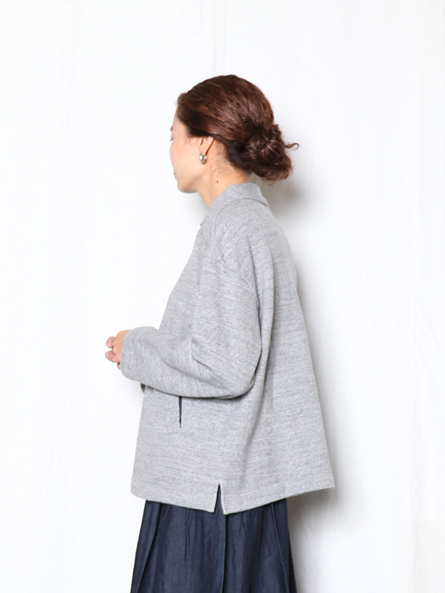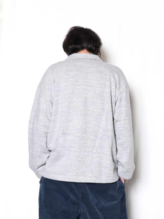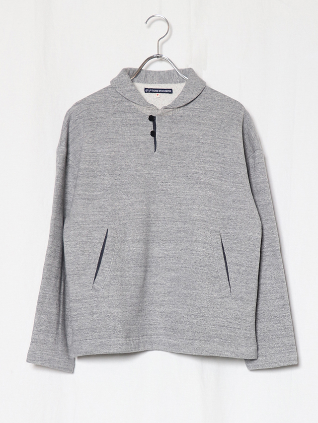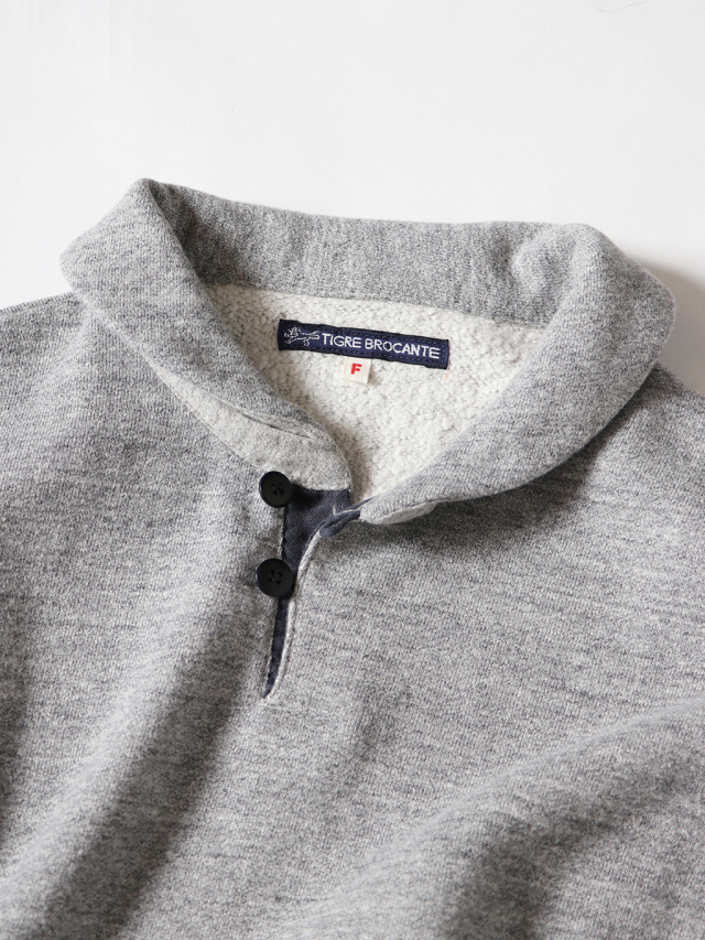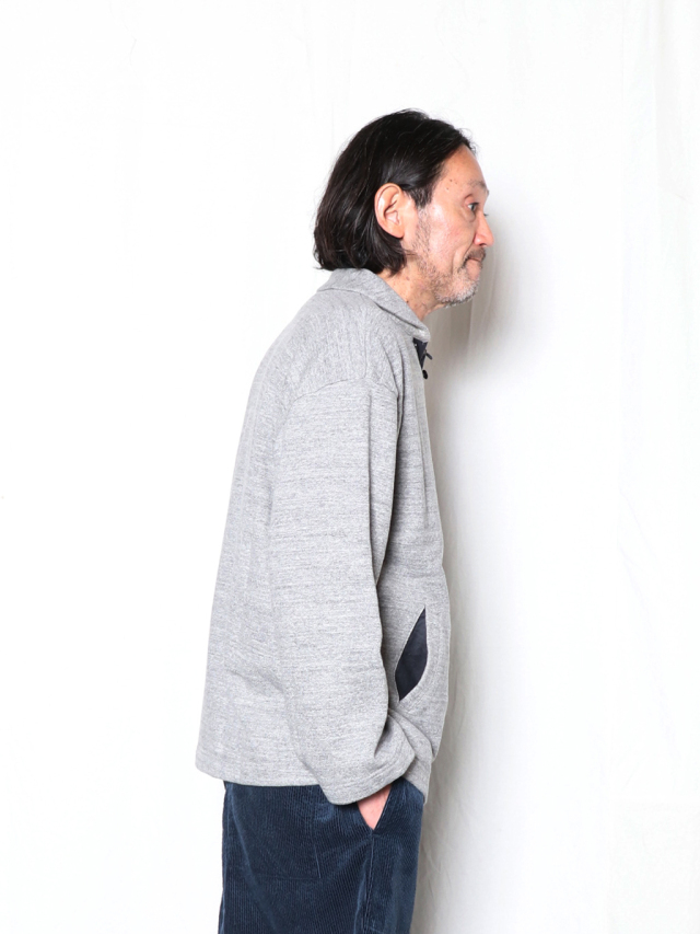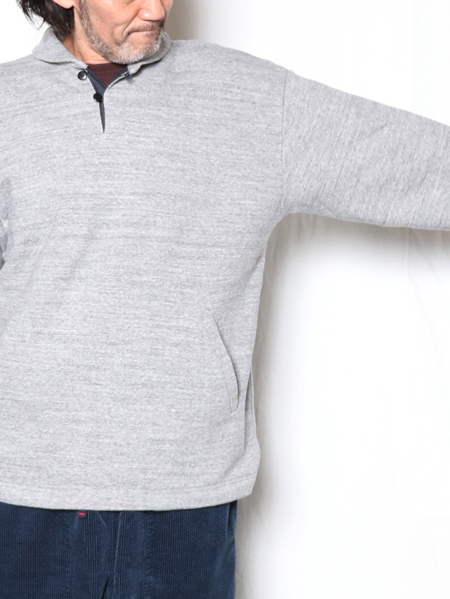 60年代の古着の裏毛、特有の起毛感を再現したオリジナルの素材で作るスウェット。生機の状態で裏に起毛をかけその後、染色とタンブラーを行い、表現しています。表糸を杢に変更し、オリジナルの杢裏毛が出来上がりました。形はショールカラータイプ。首元にボタンが2つ付いており、お好みの着方でインナーを見せたり、楽しめる一着。ポケット付きも嬉しいポイントです。
