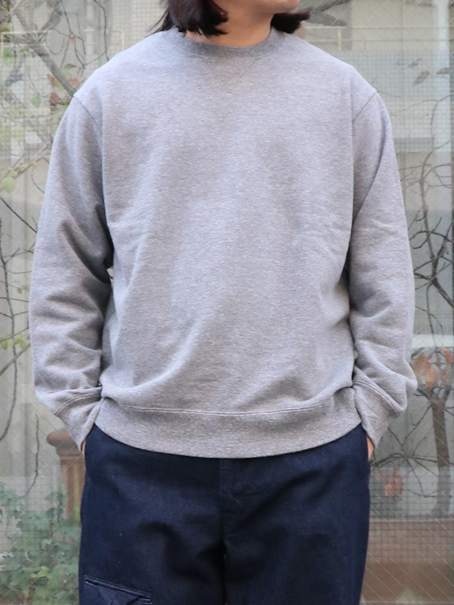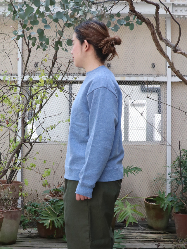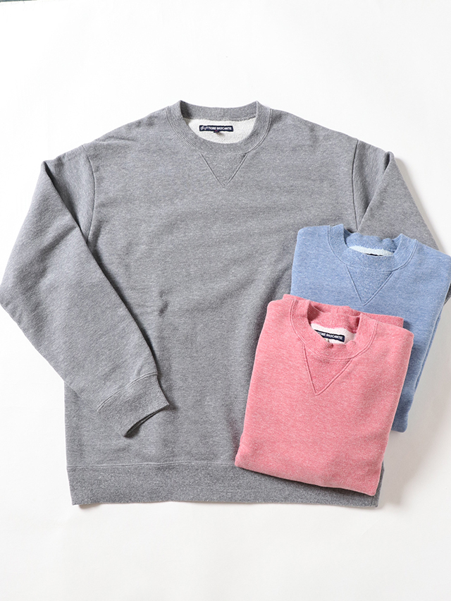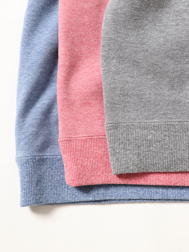 古着のような霜降り感を表現したオリジナル素材。裏毛生地ですが、ややライトな生地の厚さで春先に向けてぴったりな一枚。アウターにも響かない程よいサイズ感でご用意しました。春先にも爽やかなピンクとブルー、定番のグレーの3色が入荷しています。