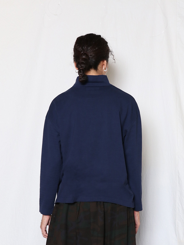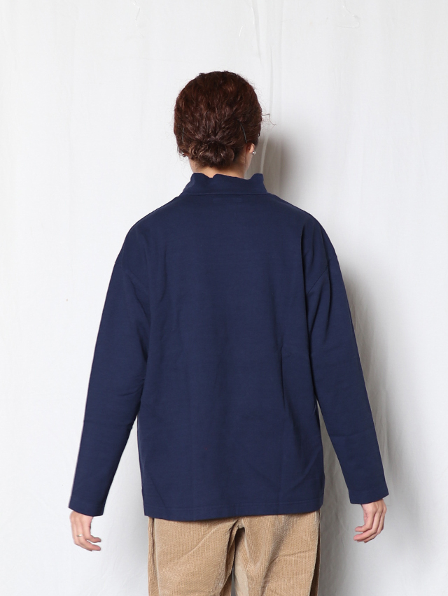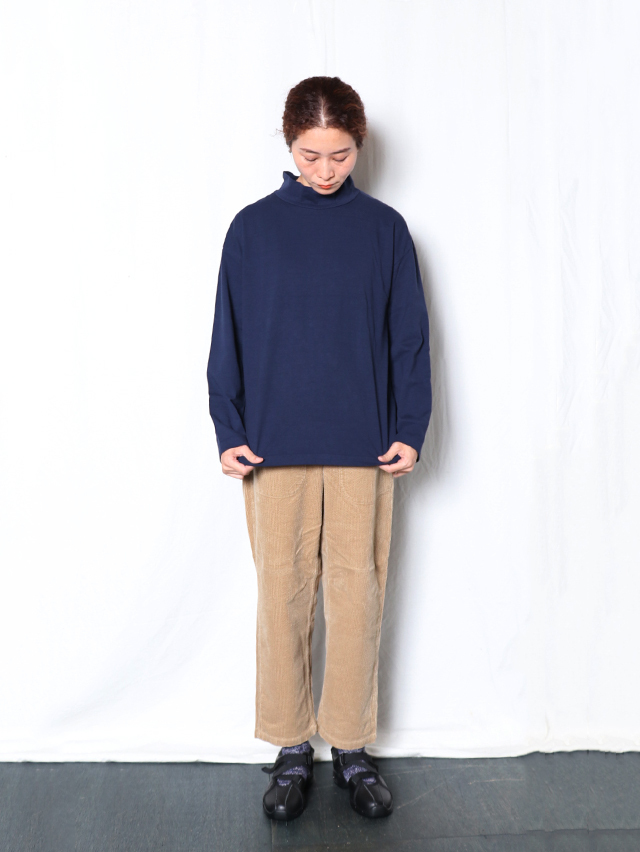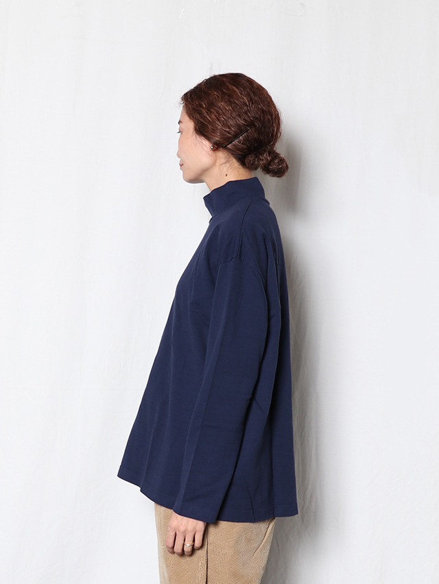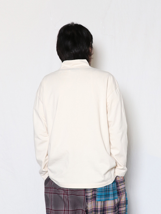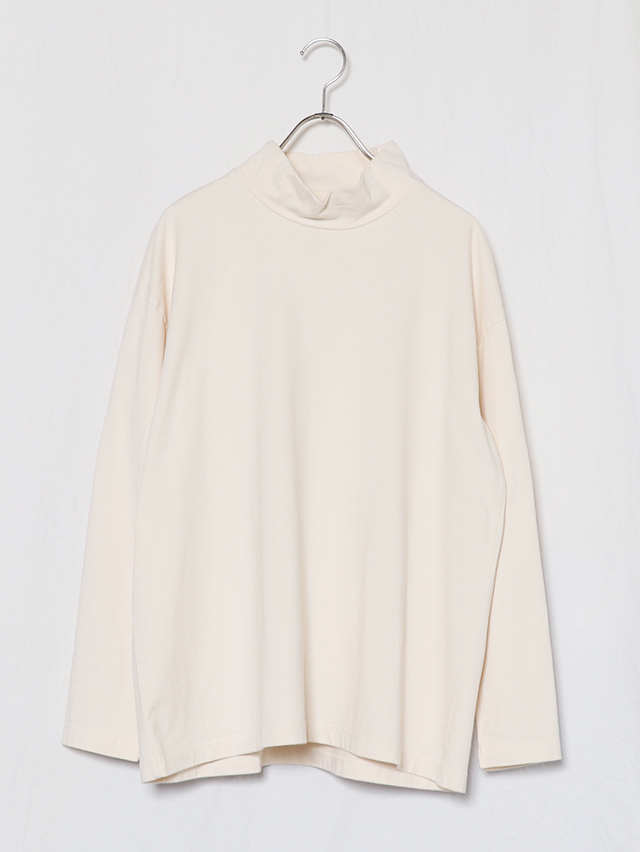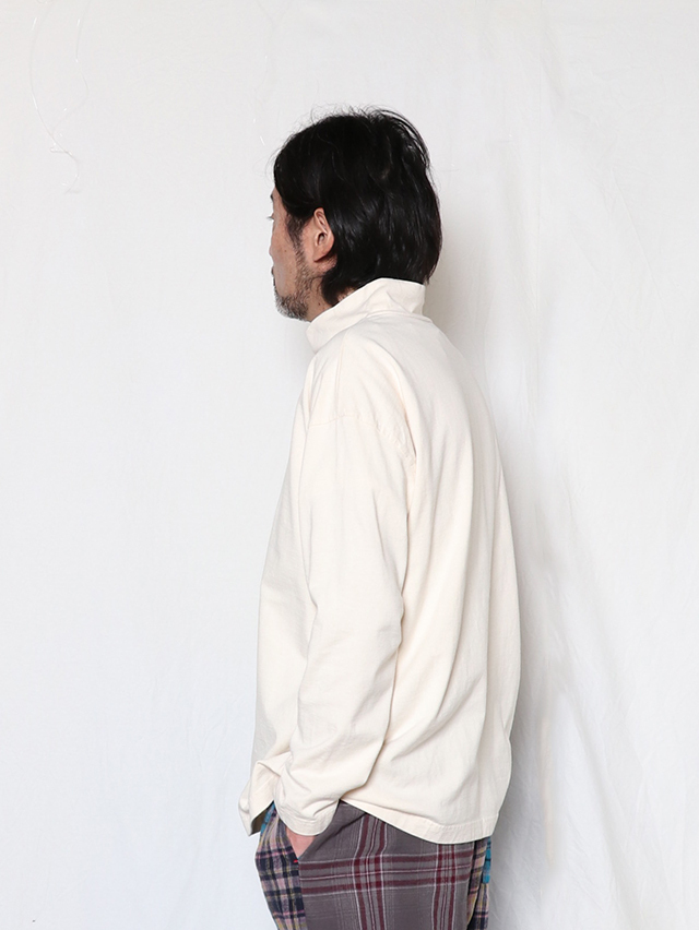 身幅広く、ゆっくりとストレスフリーな着心地のベニスビーチ型。オーバーサイズですが丈は短めの作りなので重くならずすっきりとした着用感です。生地は通常の天竺よりも倍の時間をかけ編み上げられ、凹凸感、度詰感の出ているオリジナルのフェザー天竺です。