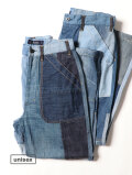 ユーズドのパンツの裾部分を使用したリメイクアイテム。デニムそれぞれの濃淡を活かしたランダムなパッチワークで仕立てています。古着本来の継ぎ目の他、ポイントで後入れしている金茶ステッチもポイント。 ワークな表情はそのままに、野暮ったく重くなりすぎないシルエットで履いて頂ける一本です。