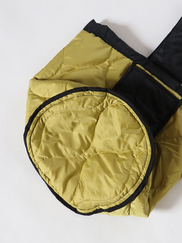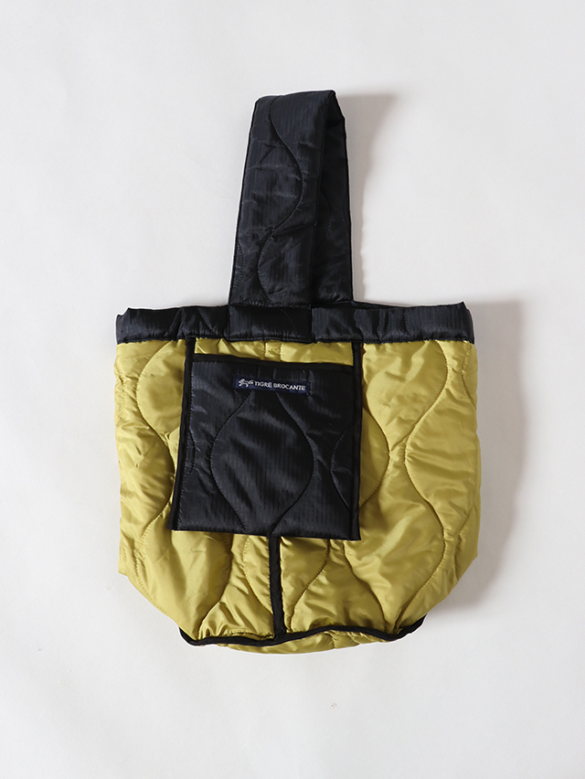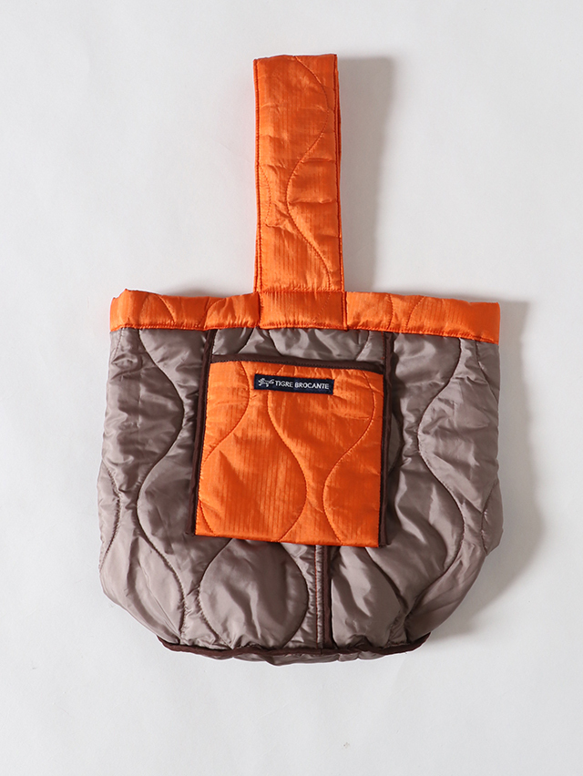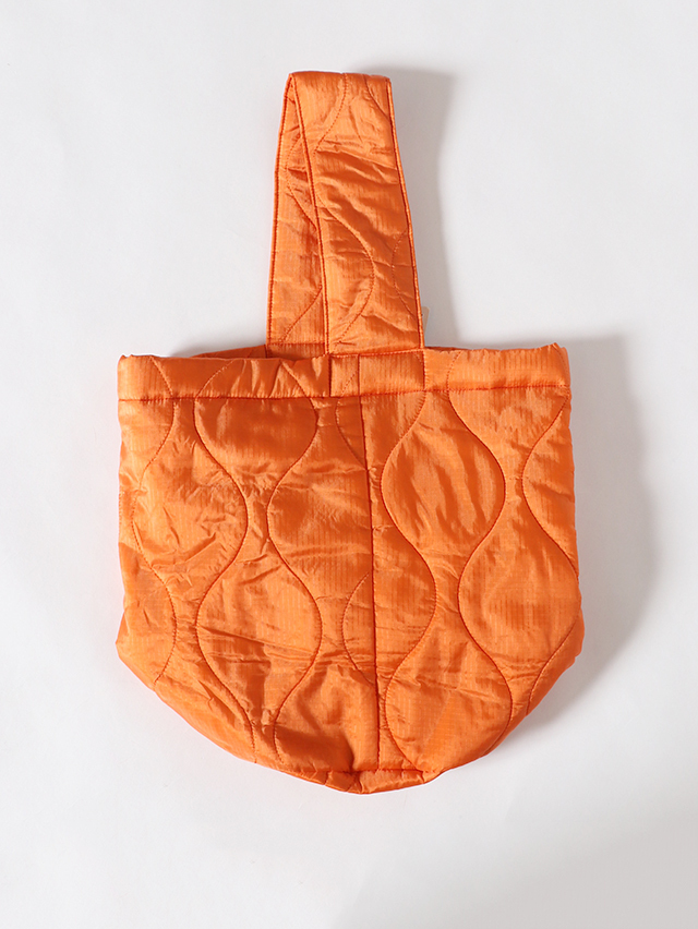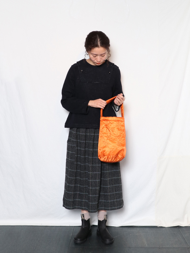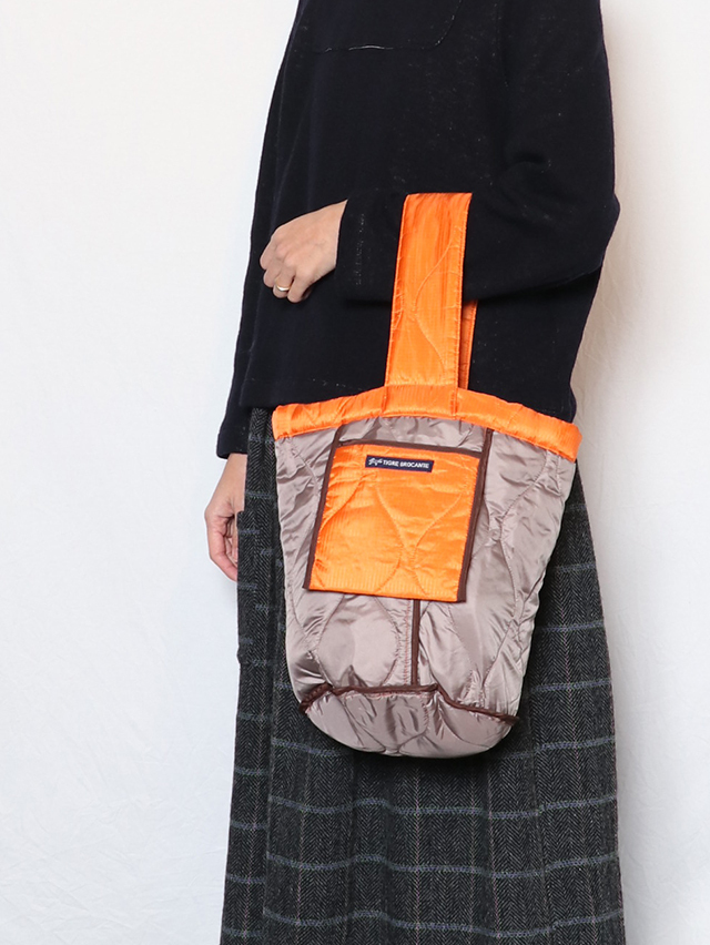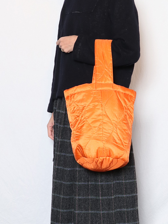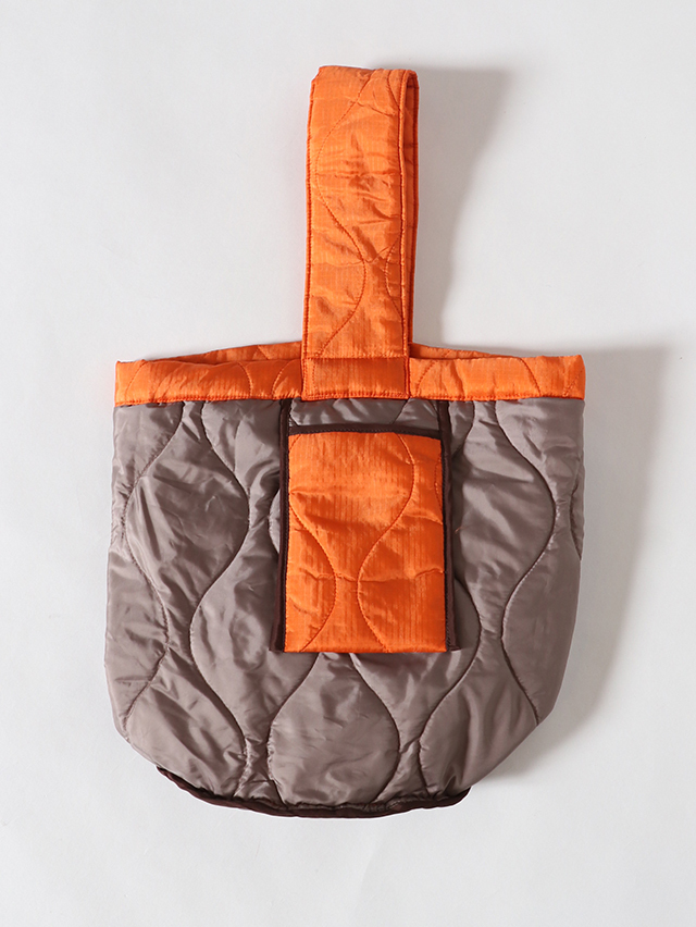 丸い底でバケツのような形。リバーシブルで使えるバッグをご用意しました。生地には格子状の織りの表情が浮かび上がるリップストップ生地を使用。裏面にはサイドにポケットがついており、スマートフォンや小物を収納できる大きさ。程よく柔らかく、肩掛けも出来る持ち手、コーディネートのポイントにもなってくれそうな一点です。