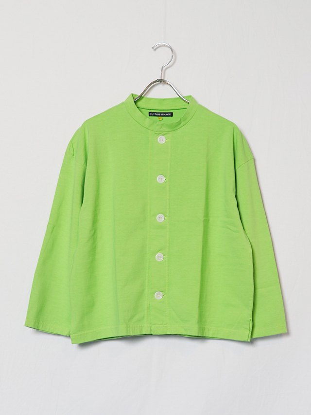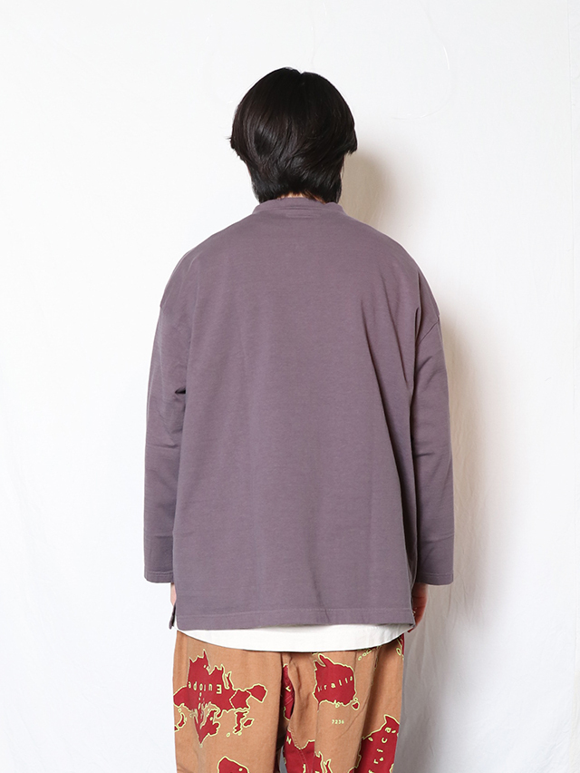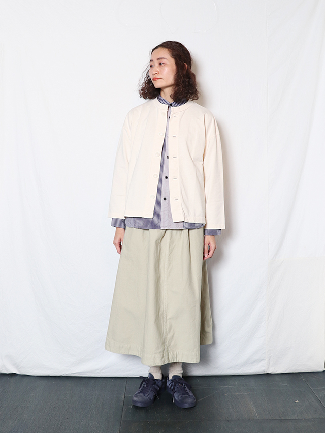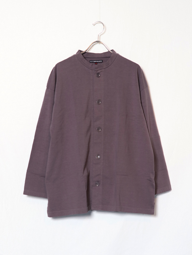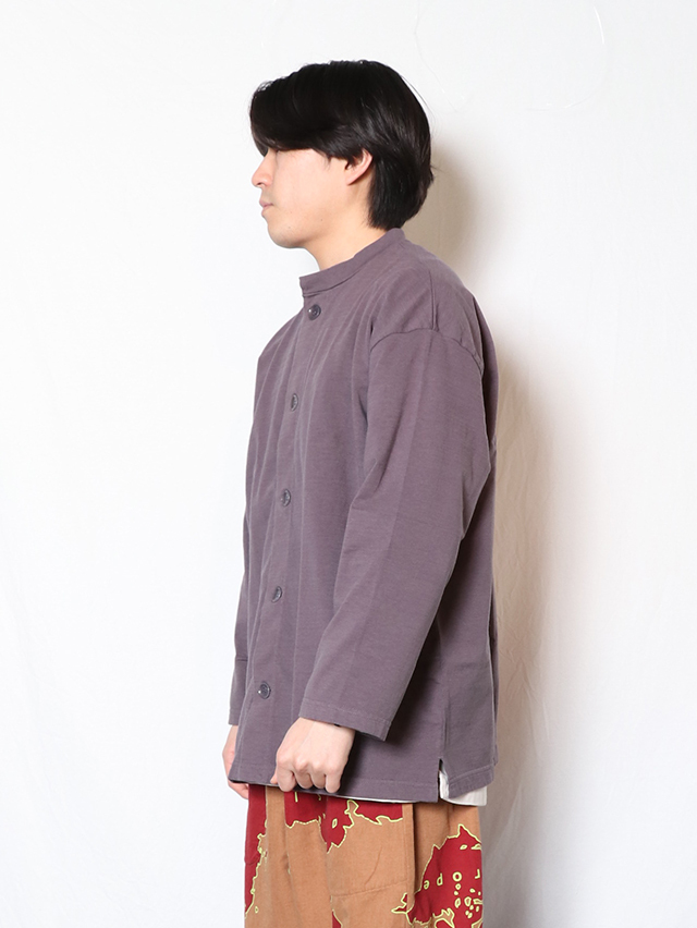 少し立ち上がった首元にゆったりとした身幅が人気のヤッコ型。通常の天竺よりも倍の時間をかけ編み上げられ、凹凸感度詰感の出ているオリジナルのフェザー天竺を使用しカーディガンを仕立てました。少し厚手のものもインナーに着れるこの形、季節の変わり目に何かと重宝します。