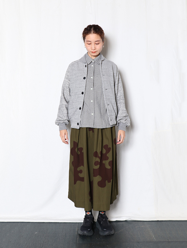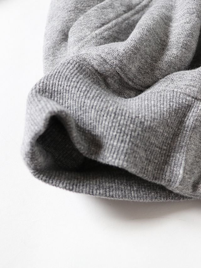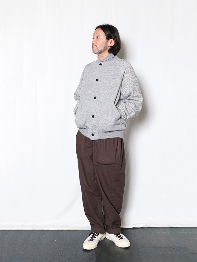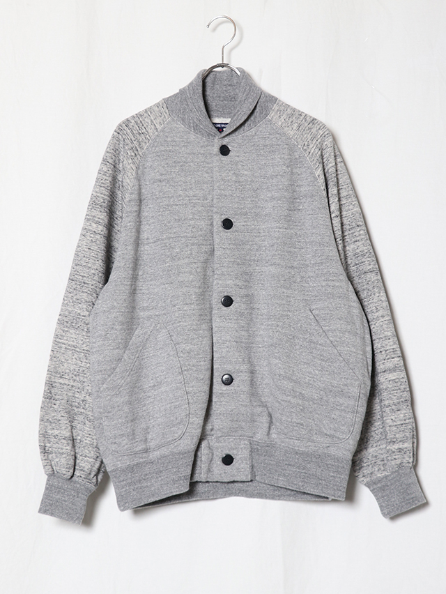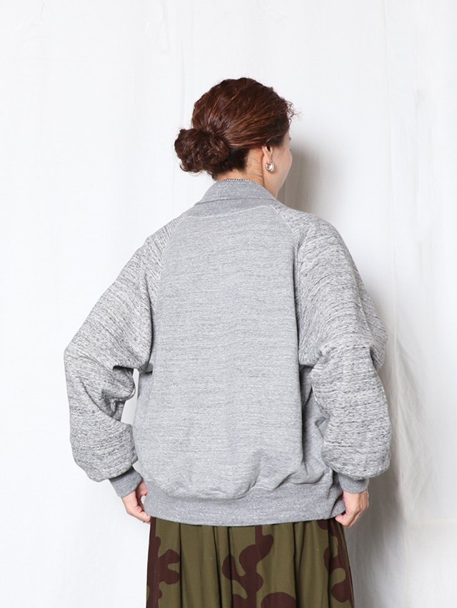 新作のベースボールジャケット。裏毛素材で出来上がりました。60年代の古着の裏毛、特有の起毛感を再現したオリジナルの素材。生機の状態で裏に起毛をかけその後、染色とタンブラーを行い風合いを表現。表糸を杢に変更した、オリジナルの杢裏毛です。