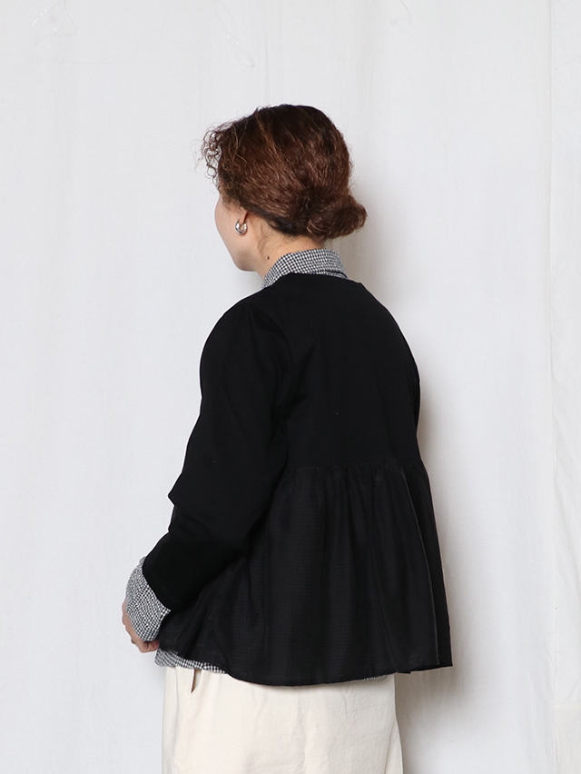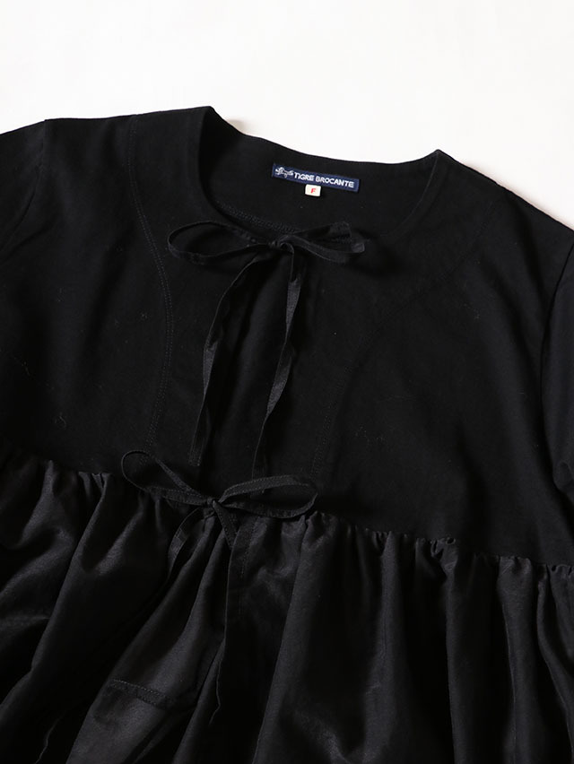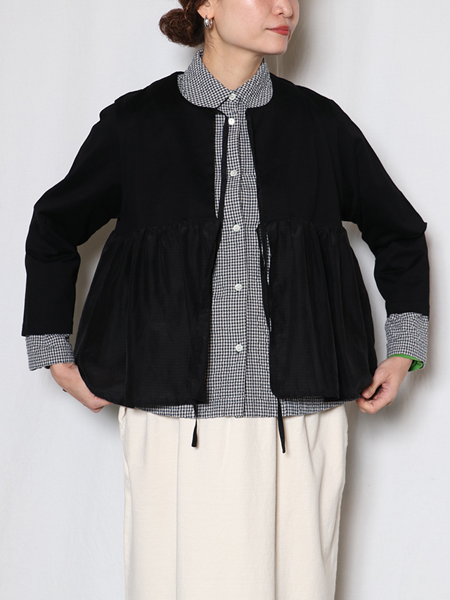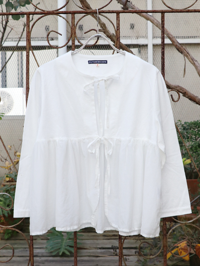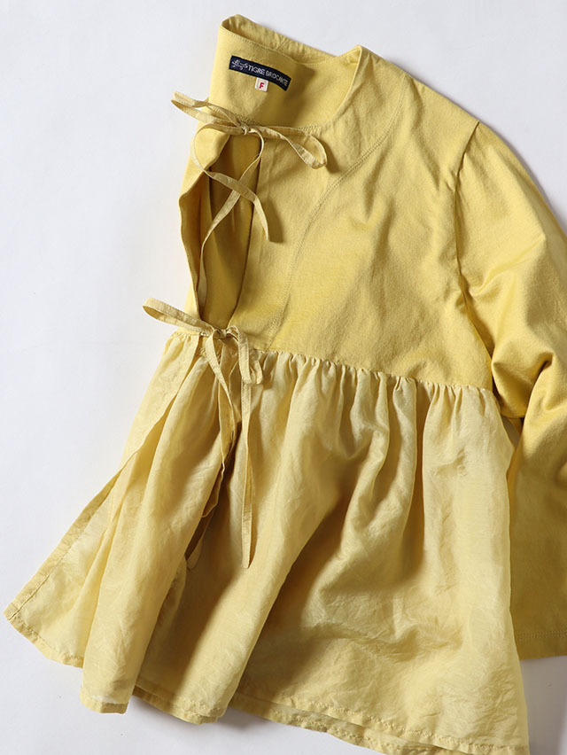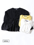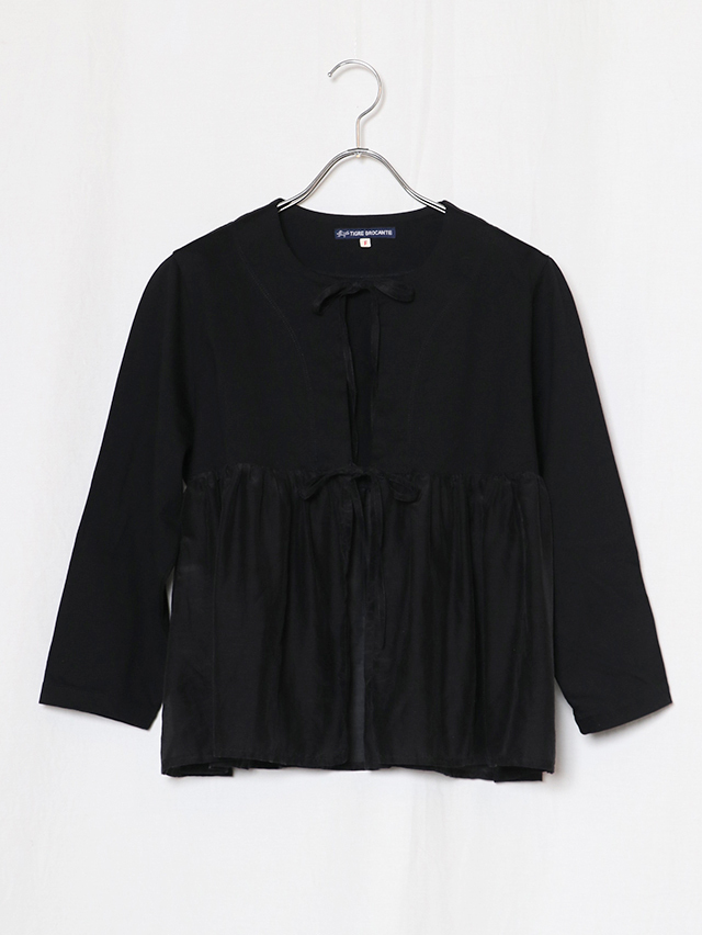 切り替えから広がるギャザーデザインの新作カーディガン。コットンシルク素材とカットソー生地を組み合わせた一着です。さらりと軽く羽織れ、リボンは結んだり、そのままにしたりとお好みのスタイリングをお楽しみいただけます。