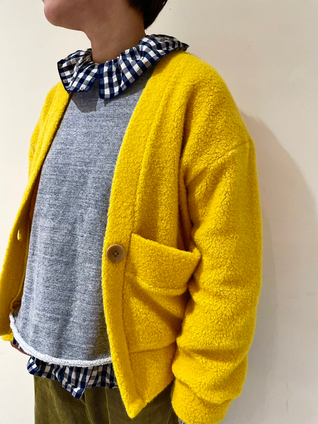 ショートな丈感で羽織りでのレイヤリングを楽しめるガウンカーディガン。素材はウールの保温性と吸湿性、パイル地のふんわりとした肌触りを併せ持つ、暖かく柔らかなウールパイル生地です。前を閉じての着用も勿論ですが、前を開けて楽しむスタイルもオススメです。