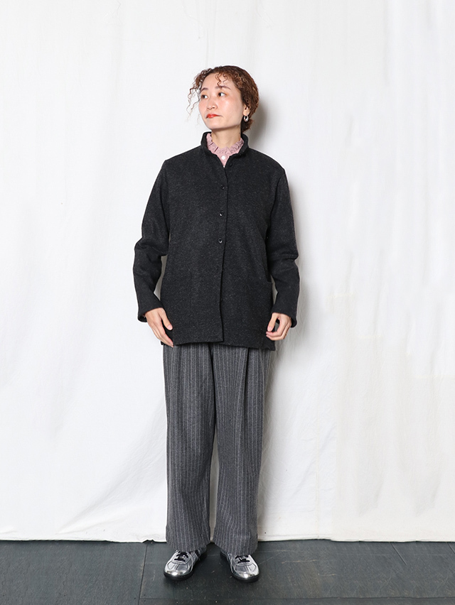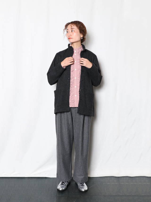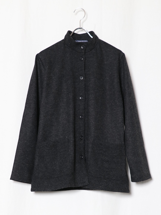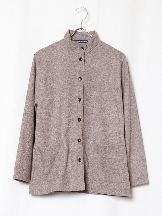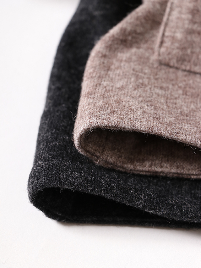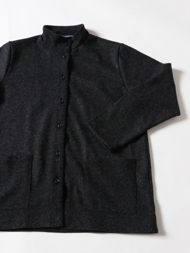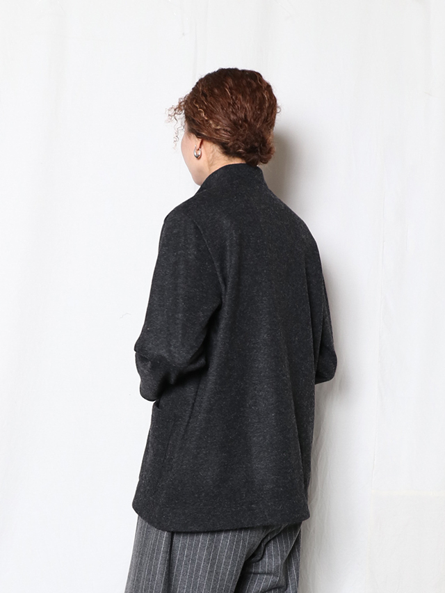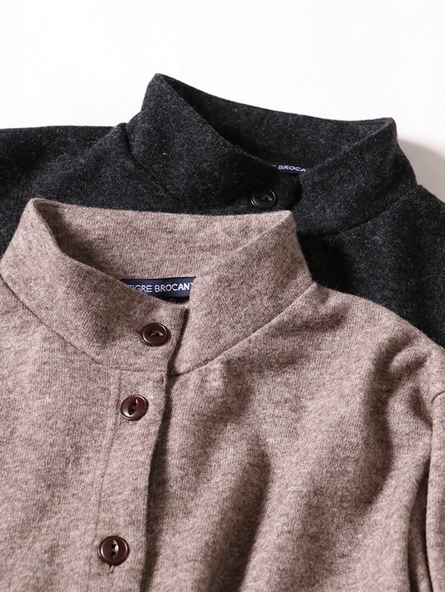 ウールニット天竺でご用意する新型のレディースカーディガン。素材はウールの保温性や吸湿性を保ちつつ、ポリエステルの特性である耐久性のある素材です。ハイネックタイプで着丈が長いタイプのカーディガン。ジャケットのような感覚で着れる一枚です。